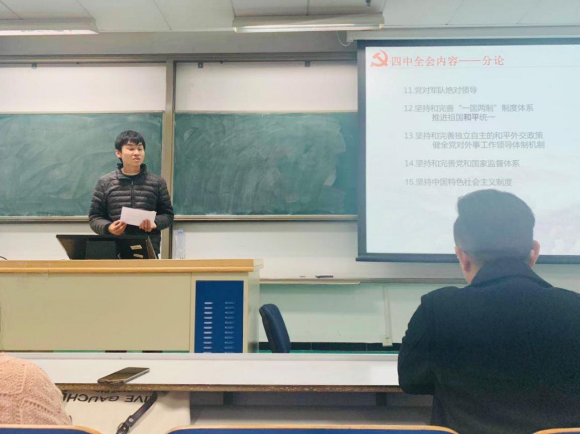 11月21日,色情动漫 2019级税务专硕一班党支部“十九届四中全会精神专题学习研讨会”在公共教学一楼1305教室顺利举行。本次研讨会由2019级税务专硕一班党支部副书记梁宸主讲,支部全体党员到场参与。