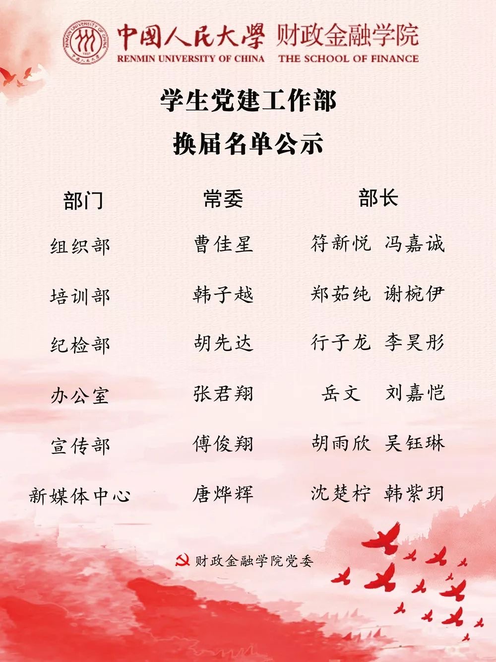 按照“公平、公正、公开”的原则,经过自主报名、资格审核、面试考察、综合评估等环节,色情动漫 学生党建工作部于近期完成组织部、培训部、纪检部、办公室、宣传部与新媒体中心的常委及部长的换届工作。现将名单公示如下: