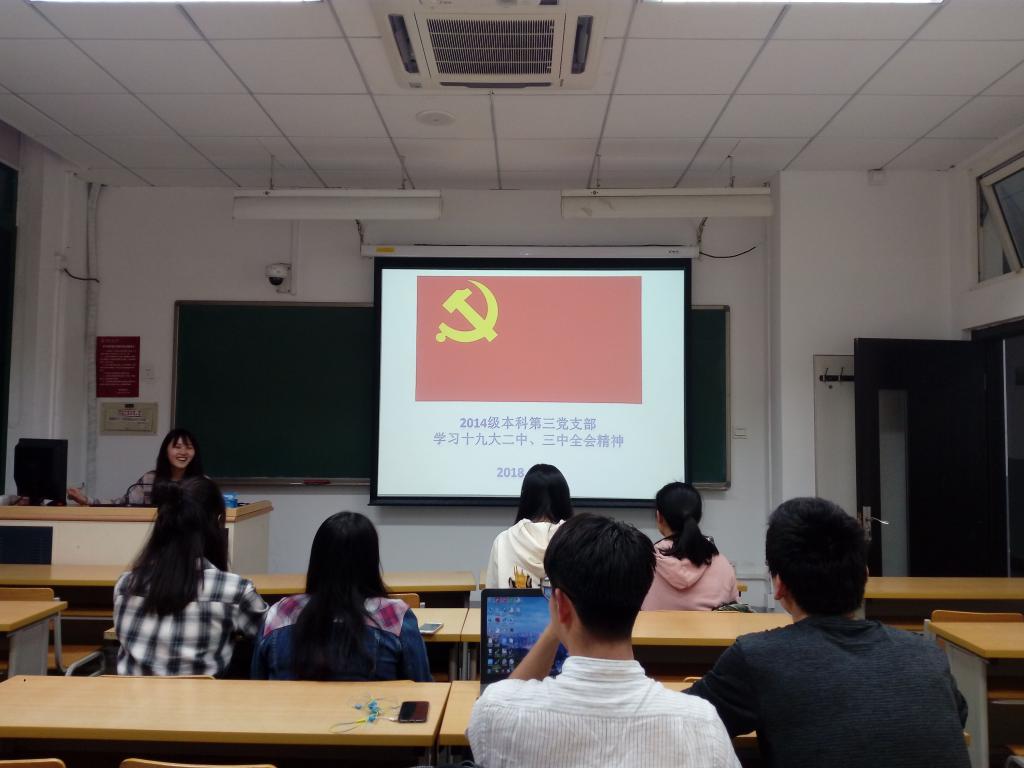 4月1日晚8:00,我院2014级本科第三党支部在教二2314顺利开展学习党的十九届二中、三中全会精神活动。本次活动由党支书李欣怡主持,支部党员参与了此次会议。