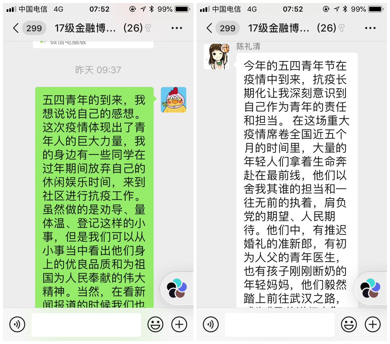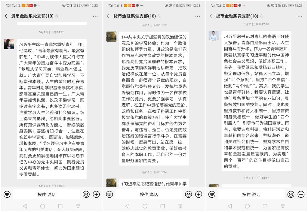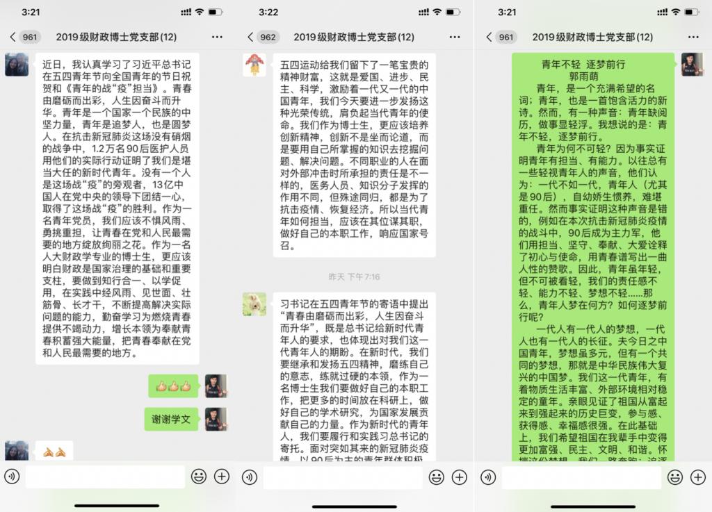 2020年5月10日,2017级金融博士党支部通过微信群开展了“弘扬五四精神”线上主题党日活动。活动组织全体党员学习了习近平总书记对新时代青年的寄语,并以文字形式分享自己的学习感想。通过学习和讨论,党支部成员们深刻领会了新时代青年的重要使命,纷纷表示作为新时代青年的一份子,要发扬不惧困难的精神,不断磨砺自身、奋斗拼搏,实现自我价值,为社会做出贡献。