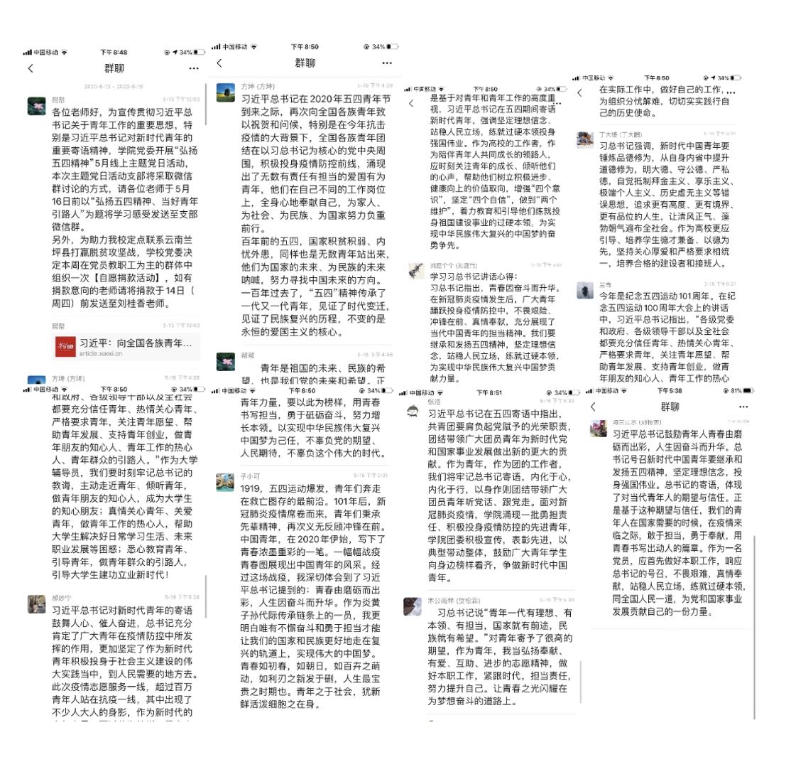 2020年5月16日,行政党支部开展了“弘扬五四精神”5月线上主题党日活动。活动采取线下自学和线上讨论相结合的方式,在认真学习了习近平总书记重要讲话后,成员们结合五四精神与教师工作进行了发言。通过本次活动,成员们表示作为高校的教育工作者应以“关心青年成长,支持广大青年建功立业”为己任,着力教育和引导青年练就投身祖国建设事业的过硬本领,为实现中华民族伟大复兴的中国梦的奋勇争先。