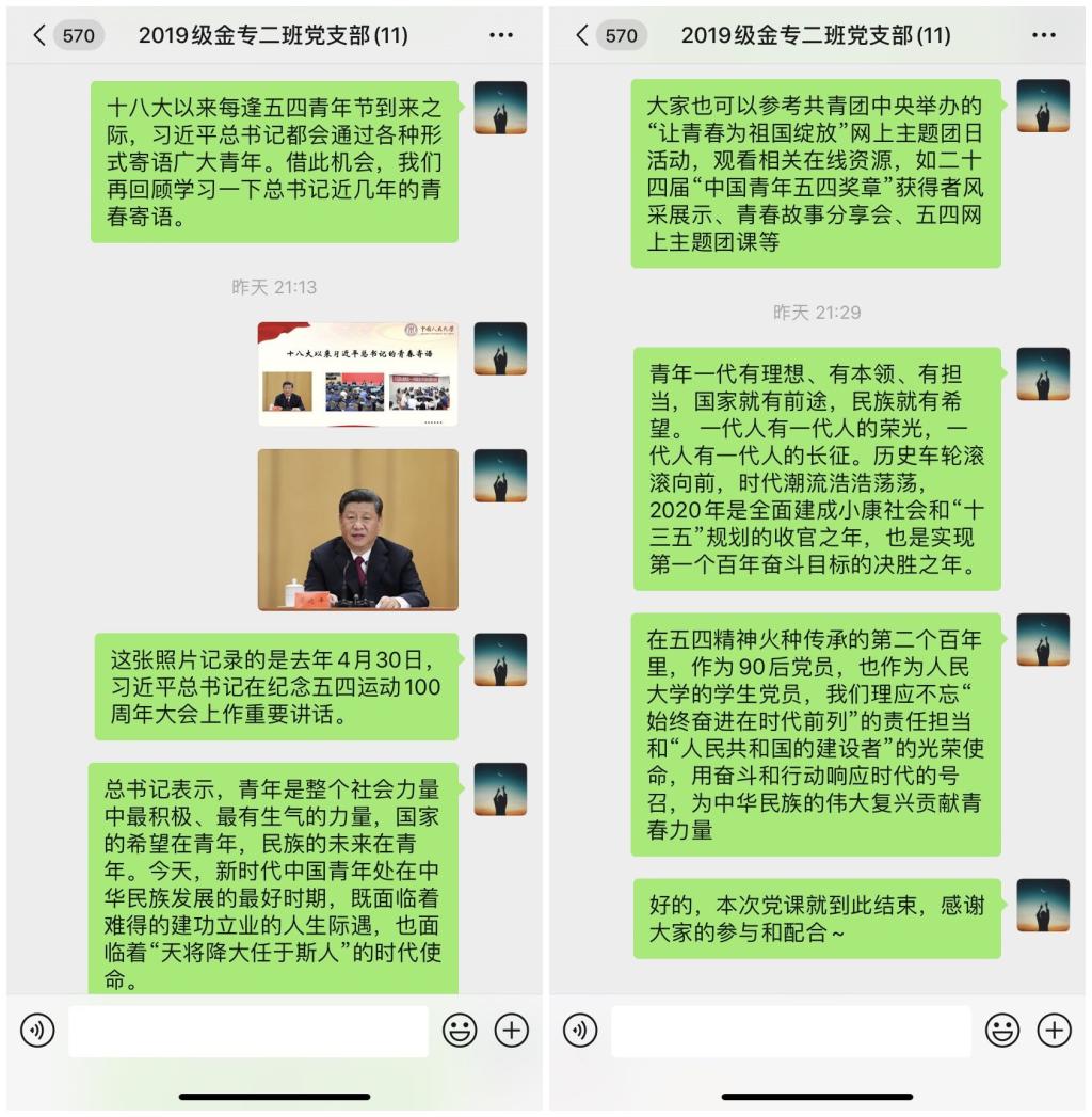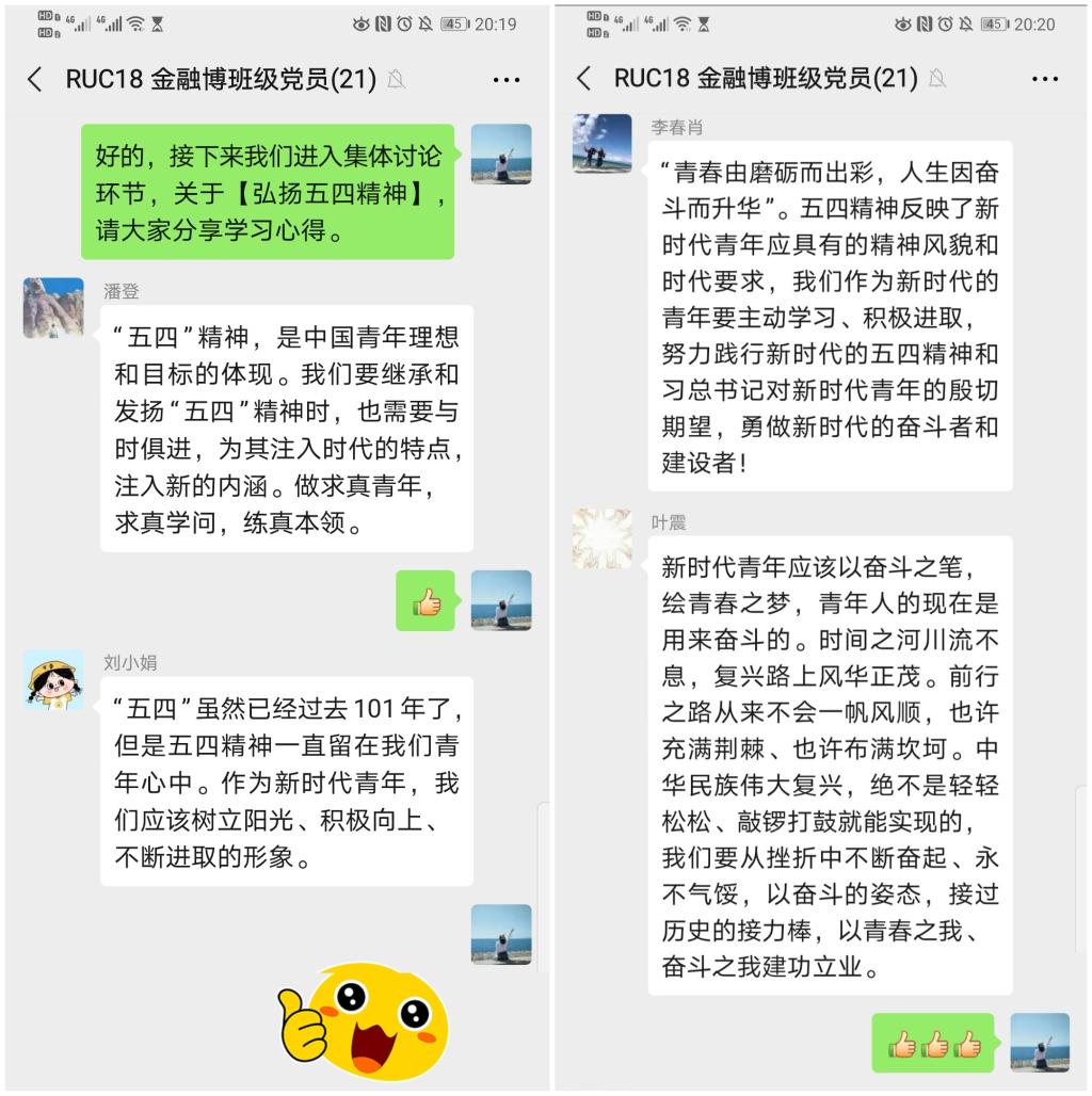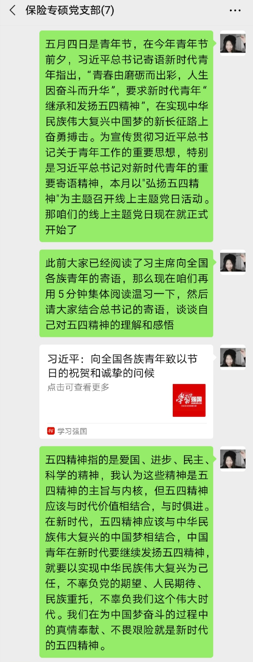 在此次线上主题党日活动中,2018级学硕党支部和保险系教师党支部等师生党支部结合就业话题或自身工作进行交流,将五四精神具象化,进一步深化了党员同志对五四精神的理解,为继续传承和发扬五四精神打下了坚实基础。