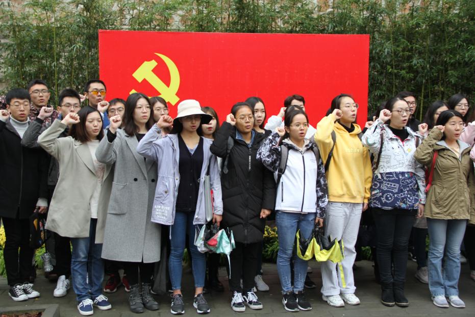 参观完双清别墅陈列馆,预备党员们走下石阶,来到庭院下方的战略指挥中心旧址。旧址前的院坝中央,一棵参天大树傲然挺立,靠山一侧则放置有一面党旗。全体预备党员聚集在党旗前齐唱《国际歌》,嘹亮的歌声在山间久久回荡。随后,全体党员正对党旗举起右拳,在学生党建工作部组织部部长冯嘉诚的带领下庄严宣誓:“我志愿加入中国共产党,拥护党的纲领,遵守党的章程,履行党员义务,执行党的决定,严守党的纪律,保守党的秘密,对党忠诚,积极工作,为共产主义奋斗终身,随时准备为党和人民牺牲一切,永不叛党。”声音铿锵有力,令人动容。宣誓活动结束后,全体预备党员徒步下山,于18时返回学校。