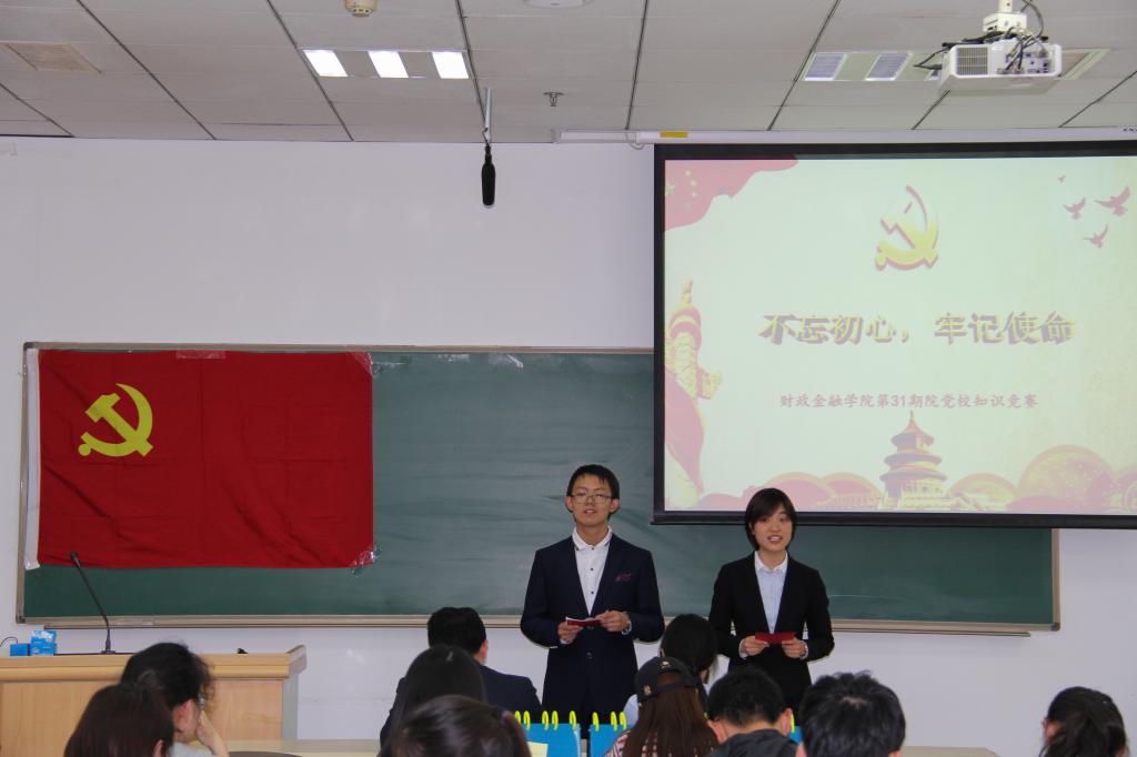 4月25日下午,我院第31期院党校积极分子培训班学习十九大精神“不忘初心,牢记使命”知识竞赛在明商0208顺利召开。我院党委副书记黄文彬、党务秘书兰青出席活动现场。本次知识竞赛由财金党建培训部韩子越、倪婧主持。