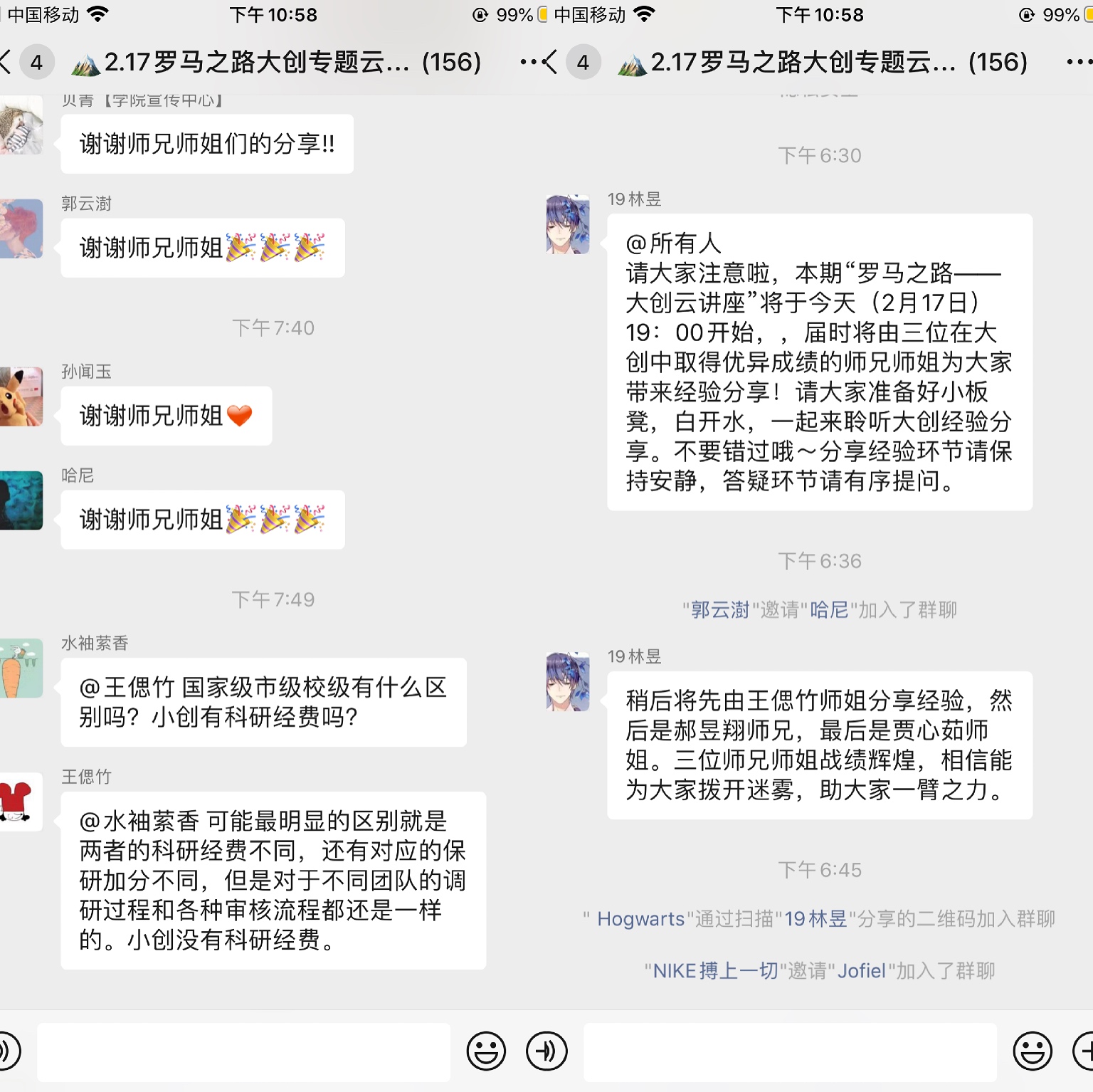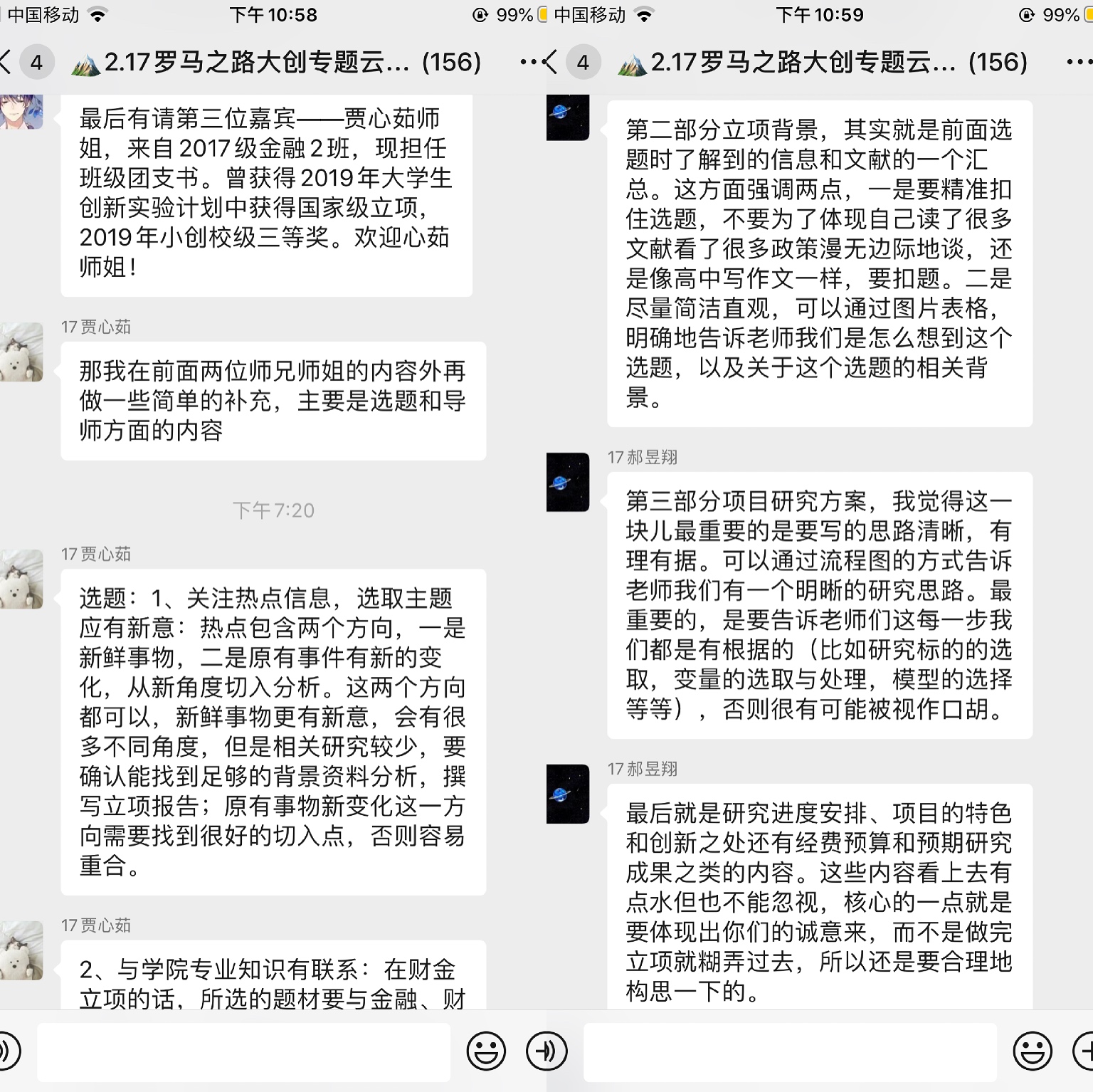 第一期“大创”主题云讲座于2月17日成功举办。云讲座邀请到三位2017级大创国家级立项的优秀嘉宾:王偲竹、郝昱翔、贾心茹同学进行线上分享。王偲竹同学首先详细介绍了大创的整体流程和基本的时间安排,其中细致地剖析了组队选题、项目立项、调研写作、中期报告、结项报告这五个环节的具体时间节点和注意事项。郝昱翔同学以自身比赛经历为切入点,与同学们分享了组队、选题以及立项书撰写过程中的重要细节和注意事项。贾心茹同学从三种角度介绍了选题的点子从哪来,最终方向怎样确定,并且还介绍了邀请导师指导当面的贴士。分享结束后,群内的同学们与三位朋辈嘉宾互动交流,答疑解惑。此次云讲座持续时间约为一小时,总计近两百位同学加入线上群聊积极参与交流。