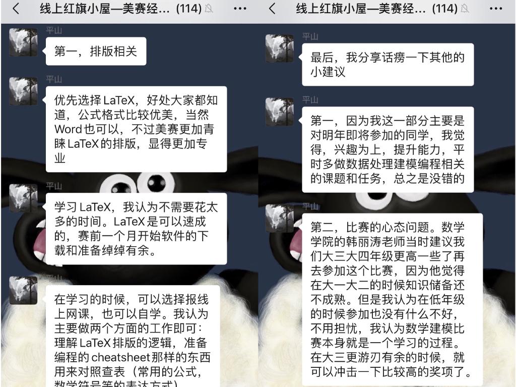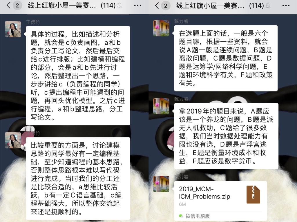 第一周“红旗小屋”线上咨询活动于2月11日晚19:00左右成功举办,咨询主题为“美赛经验分享”,邀请三位在往年美国大学生数学建模竞赛中曾取得优异成绩的党员嘉宾:陈力睿,金可欣,王偲竹同学为同学们线上答疑。陈力睿同学首先向大家介绍了今年美赛在比赛时间、赛制等方面做出的多项调整,同时分享了美赛进行阶段针对时间冲突等问题该如何处理,并结合个人经历对思路方法的选择以及论文撰写方面提出了一些注意事项;金可欣同学针对明年参加美赛的同学详细介绍了报名方式及注意事项,并进行了建模学习方法和学习资源的分享;王偲竹同学分享了自己两次参加美赛的经历,具体阐述了比赛的具体过程和分工,为同学们提供了宝贵的参赛经验。三位嘉宾结合模型选择、论文写作、团队合作等方面的成功经验为同学们献上美赛“获胜秘籍。1个半小时的值班时间共吸引了111名同学前来咨询,热度相比线下丝毫不减,进一步充实了同学们的假期生活。