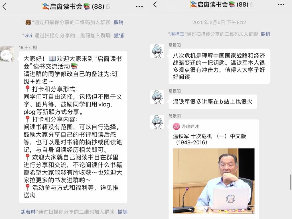 根据学校延期开学、指导学生居家自学的安排,党建带团建,色情动漫 团委策划启动启窗读书会,为财金学子搭建了一个特殊假期中阅读、分享、交流、探讨的云平台,同学们灵活利用线上微信群里和plog、vlog等新颖的分享形式。自活动发起以来,参与人数近百人,各种形式的分享和打卡近200次,涵盖书籍百余本。