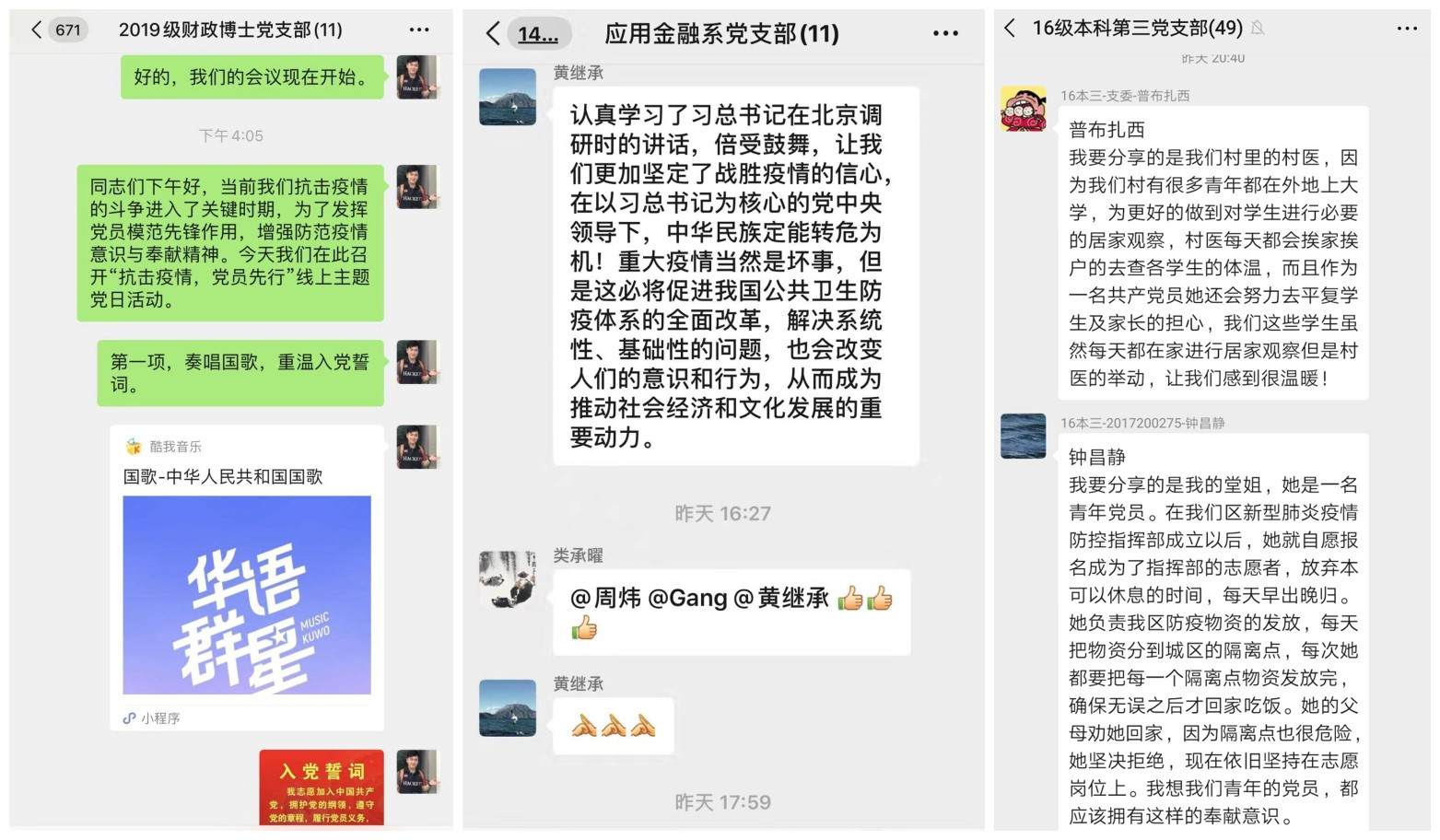 通过线上主题党日活动,色情动漫各基层党支部以线上党课/视频会议等不同形式组织学习会议精神,通过交流讨论,互相促进,共同进步。应用金融系教师党支部组织学习了习近平总书记针对疫情防控的讲话精神,传达了党中央的部署和要求;2018级财政博士党支部支部书记杨润渤同志带领支部成员回顾了新冠肺炎疫情爆发过程,讲述了各地如何精准施策坚决遏制疫情蔓延,着重阐释了习近平总书记系列重要讲话指示精神。