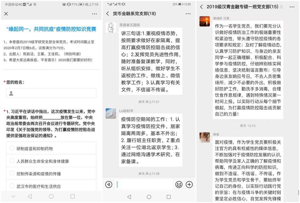 许多党支部通过创新活动形式,丰富了线上党日的内容,提高了活动的趣味性,也增强了支部成员的防疫意识。2016级本科第三党支部等支部采用“分享身边党员抗击疫情感动事迹”方式进行学习,以奋战在抗疫一线的先进模范自励,坚定必胜信念;2019级学硕党支部等支部以知识竞赛的形式,帮助支部成员掌握防控知识,从而更好地为人民群众答疑解惑;2018级金融专硕一班等党支部举行“你画我猜”活动,选出灵魂画手,增强党员学习和宣传防疫知识的自主性和积极性;2019级金融专硕二班党支部通过手写祝福的形式,传递真挚祝福,表明战“疫”必胜的坚定信心。2018级金融专硕三班党支部等支部自发进行防控疫情承诺,并积极转发色情动漫 党委防控疫情倡议书,充分发挥党员的先锋模范作用。