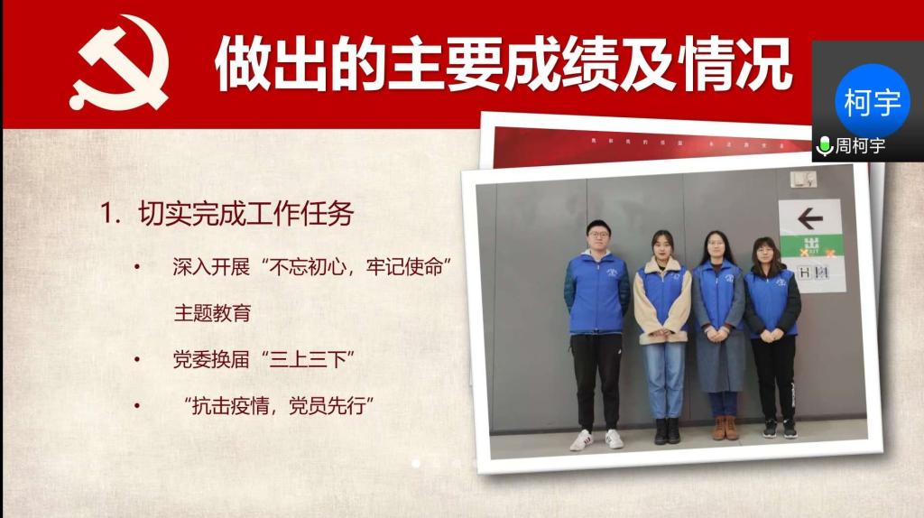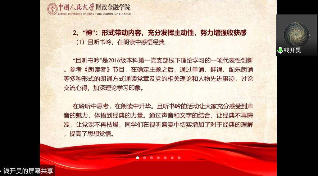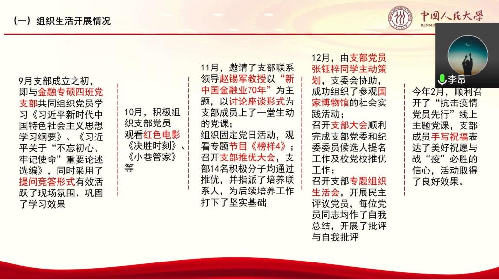 本年度,2016级本科第一党支部、2016级本科第二党支部、2016级本科第三党支部、2016级本科第四党支部、2019级金融专硕一班党支部、2019级金融专硕二班党支部、2019级金融专硕三班党支部、2019级金融专硕四班党支部、2019级保险专硕党支部、2019级税务专硕一班党支部、2019级税务专硕二班党支部、2019级学硕党支部、2019级汉青金融专硕一班党支部、2019级汉青金融专硕二班党支部、2019级汉青金融专硕三班党支部、2019级汉青学硕党支部、2019级金融博士党支部、2019级财政博士党支部18个学生党支部书记先后进行现场述职,其余师生党支部书记进行书面述职。