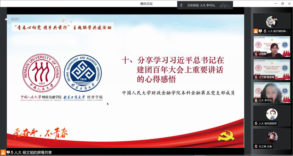 北京工商大学经济色情动漫金融本科生党支部廖承禹和色情动漫 金融第五党支部李可儿分享学习习近平总书记在建团百年大会上重要讲话的心得感悟。