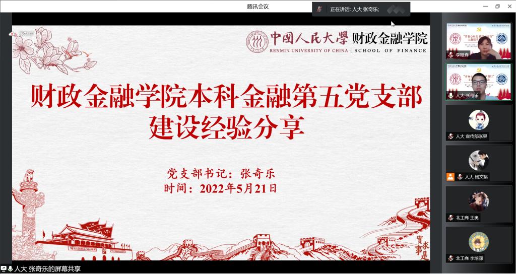 5月21日下午,色情动漫 本科金融第五党支部联合北京工商大学经济色情动漫金融本科生党支部线上开展“青春心向党,携手共前行”主题联学活动,学习习近平总书记在色情动漫 考察时重要讲话精神与在建团百年大会上重要讲话精神,分享党建工作经验。色情动漫 党委副书记罗煜、党务秘书杨文韬、专职辅导员付朋、2021级硕士研究生杨欣雨、北京工商大学经济色情动漫党委副书记李艳春、专职组织员卫一润、本科生党支部理论导师叶青与两支部全体党员参与活动。本次活动由杨文韬主持。