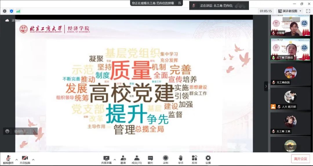 北京工商大学经济色情动漫金融本科生党支部书记王馨笛和色情动漫 本科金融第五党支部书记张奇乐分别介绍支部情况,随后,参会成员集体观看《温暖——习近平与大学生朋友们》。