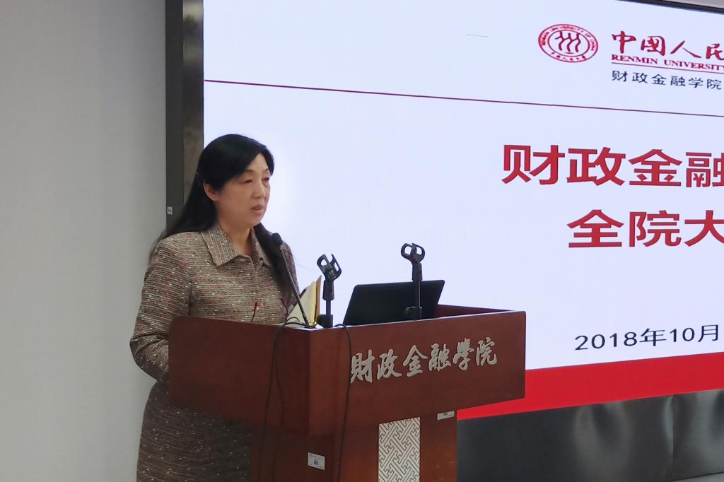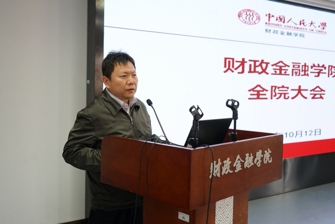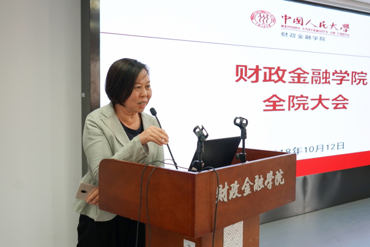 10月12日中午,我院2018-2019学年秋季学期全院大会在明德主楼830会议室召开。我院院长庄毓敏,党委书记孙华玲,副院长赵锡军、张成思、岳树民、谭松涛,党委副书记黄文彬、类承曜等领导班子成员与全院教职工参加会议,学校研究生院专业学位培养与管理办公室主任马胜利受邀参加。会议由我院党委书记孙华玲主持。