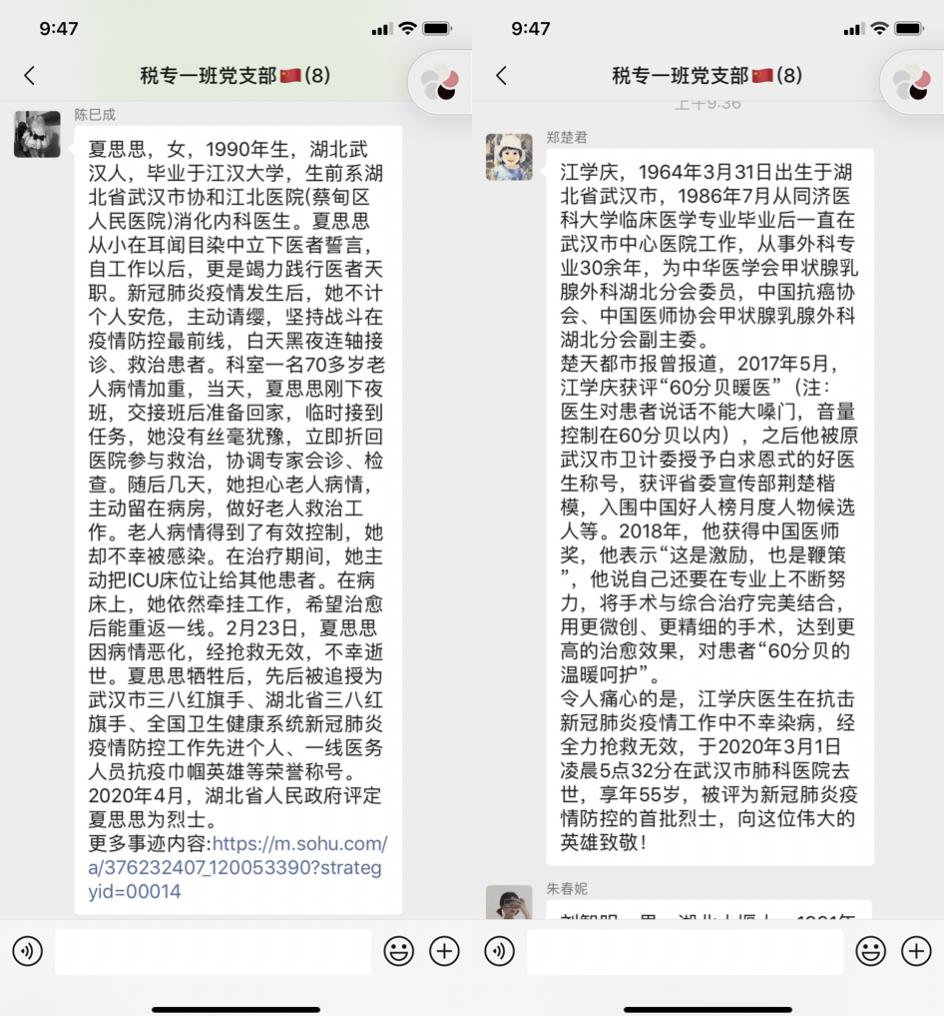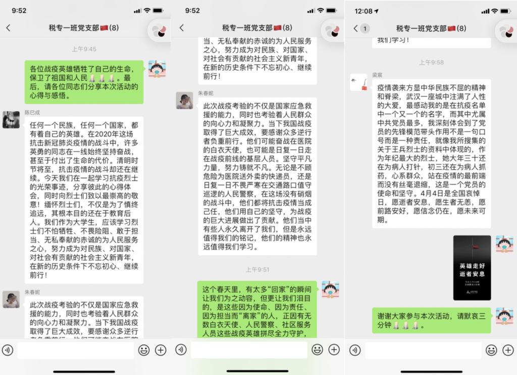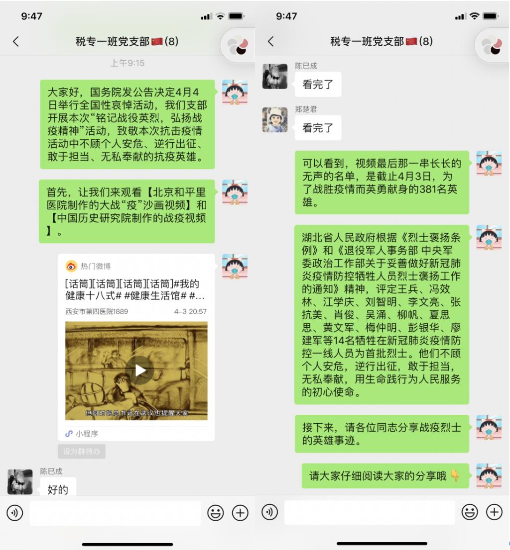2020年4月4日是全国哀悼日。为纪念在抗疫中牺牲的烈士和逝去的同胞,致敬战疫中不顾个人安危、逆行出征、敢于担当、无私奉献的抗疫英雄,色情动漫 2019级税务专硕一班党支部在微信群举办了“铭记战疫英烈,弘扬战疫精神”支部活动。本次活动由党支书冯欣然同志主持,支部全体成员。