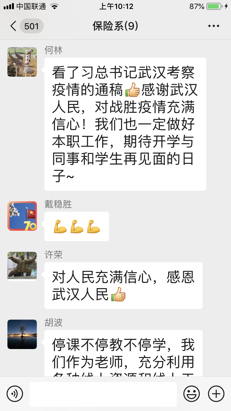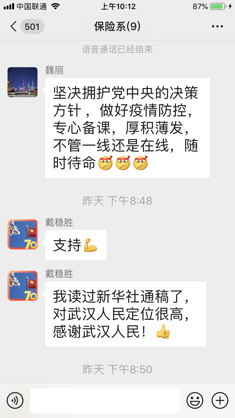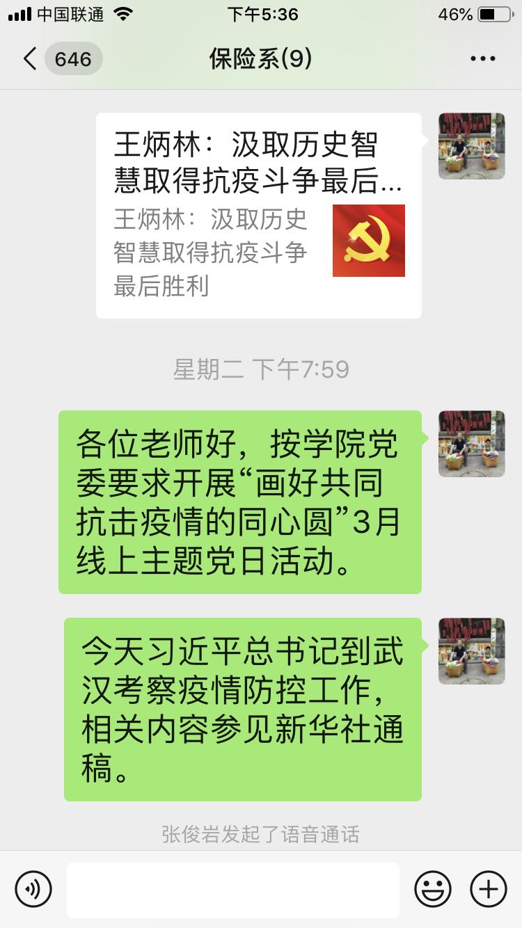 新冠肺炎疫情既是危机也是一堂深刻的风险意识教育课。保险作为市场经济条件下风险管理的基本手段,应该在疫情风险管理中发挥应有的作用。保险系支部党员教师结合疫情发生过程中的问题,讨论策划停课不停学系列公益课程,从拨备救灾、保险规划、保险科技、保险投资等角度讲解保险在风险管理中的作用以及疫情对保险的影响。大家在视频交流中讨论了授课内容、授课平台、讲课效果、宣传策划以及本专业课程教学等各方面的问题。