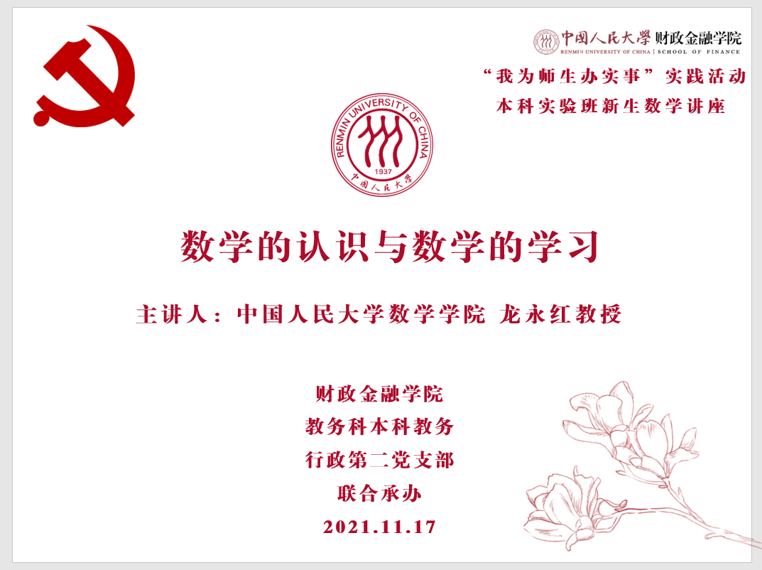 2021年11月17日下午,色情动漫 “我为师生办实事”实践活动之“本科实验班新生数学讲座”在公共教学楼三楼3201教室顺利举办。本次讲座由色情动漫 主办,色情动漫教务科本科教务与行政第二党支部联合承办。活动邀请色情动漫 研究生院副院长、数学色情动漫龙永红教授为2021级本科“财政数学”、“金融数学”和“金融科技”三个实验班新生作“数学的认识与数学的学习”专题讲座。实验班班主任代表、2021级本科金融科技实验班班主任邱志刚老师、色情动漫教务科本科教务和行政第二党支部部分党员同志参与讲座。