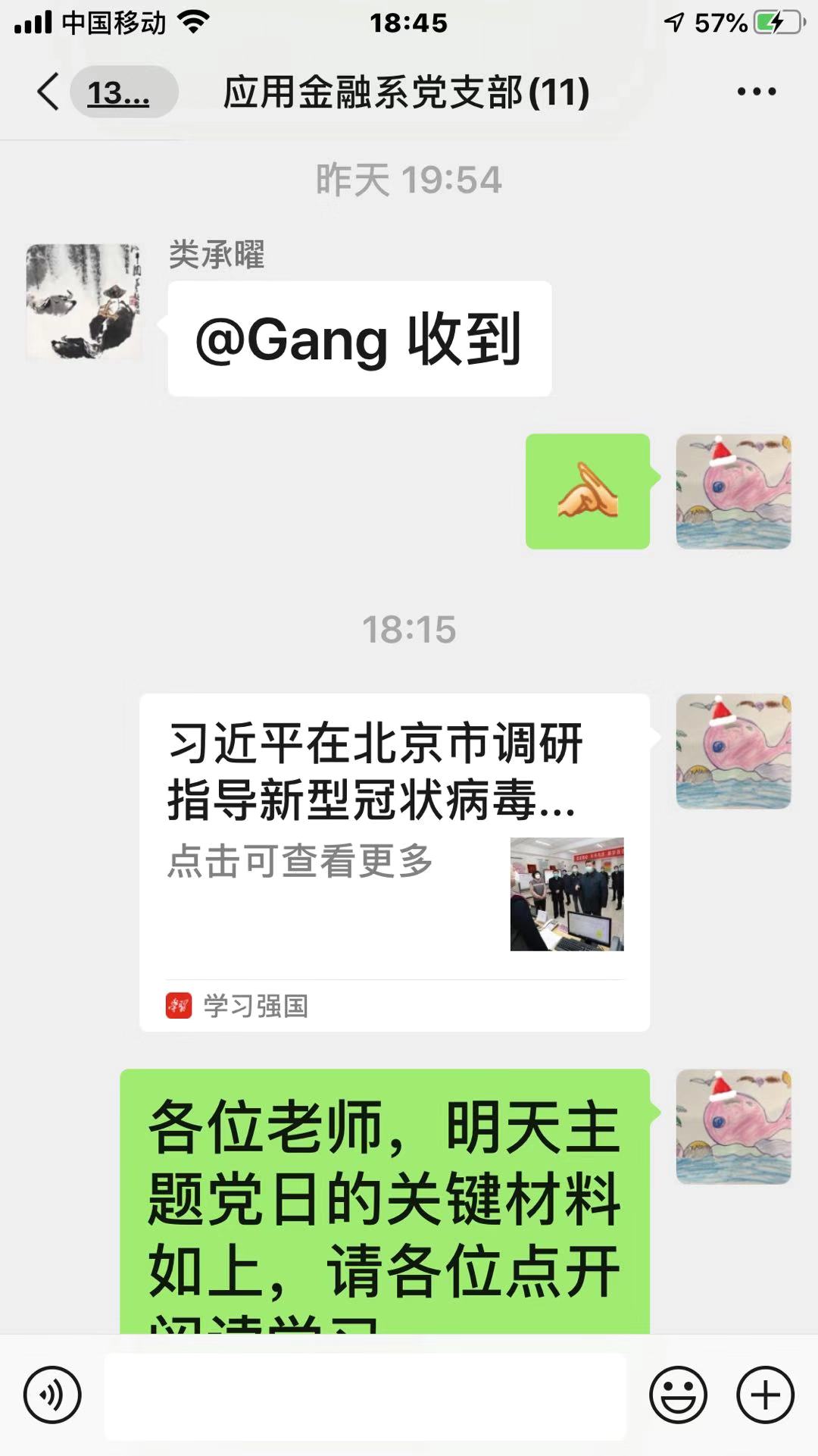 2020年2月12日,色情动漫 应用金融系教师党支部开展“抗击疫情,党员先行”线上主题活动。在新型冠状病毒感染的肺炎疫情防控关键时期,切实动员广大党员在疫情防控阻击战中作表率争先锋。