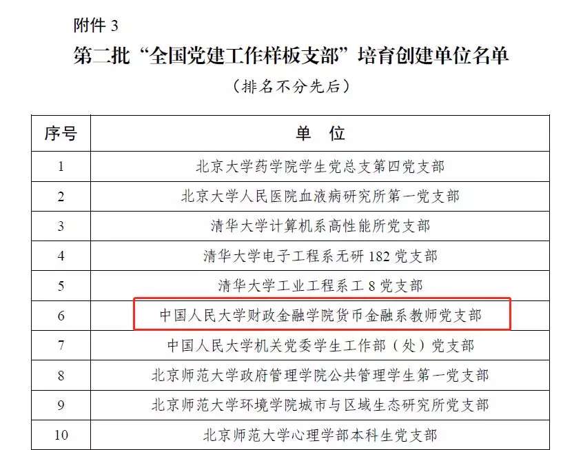1月8日,教育部办公厅公布第二批全国党建工作示范高校、标杆院系、样板支部培育创建单位名单,我院货币金融系教师党支部成功入选第二批“全国党建工作样板支部”培育创建单位名单。