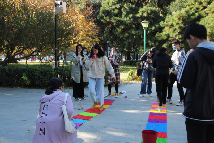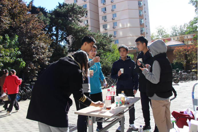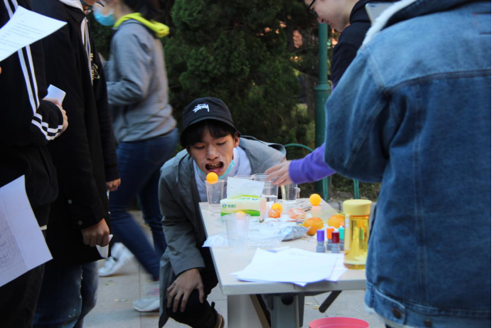 卡牌不是人人有份,游戏却是想来就来。综艺范十足的创意小游戏,是定向越野的关键加分项。活动开始几分钟后,不少同学就发现了校园内的游戏活动点。博物馆门口的“盲人喂食”需要两位同学相互配合,使用特制长筷,夹取桌面上的小美食。邮局门口的“双人接球”需要两位同学作人体篮筐,另外两位同学配合投篮。品园附近的“人力车轮”,北区食堂门口“一饮而尽”……大多数游戏要求多人参与,是对体力和默契的双重考验。有的小组跌跌撞撞地尝试,有的小组围观并商讨战术,各个游戏点充满了同学们的欢声笑语。