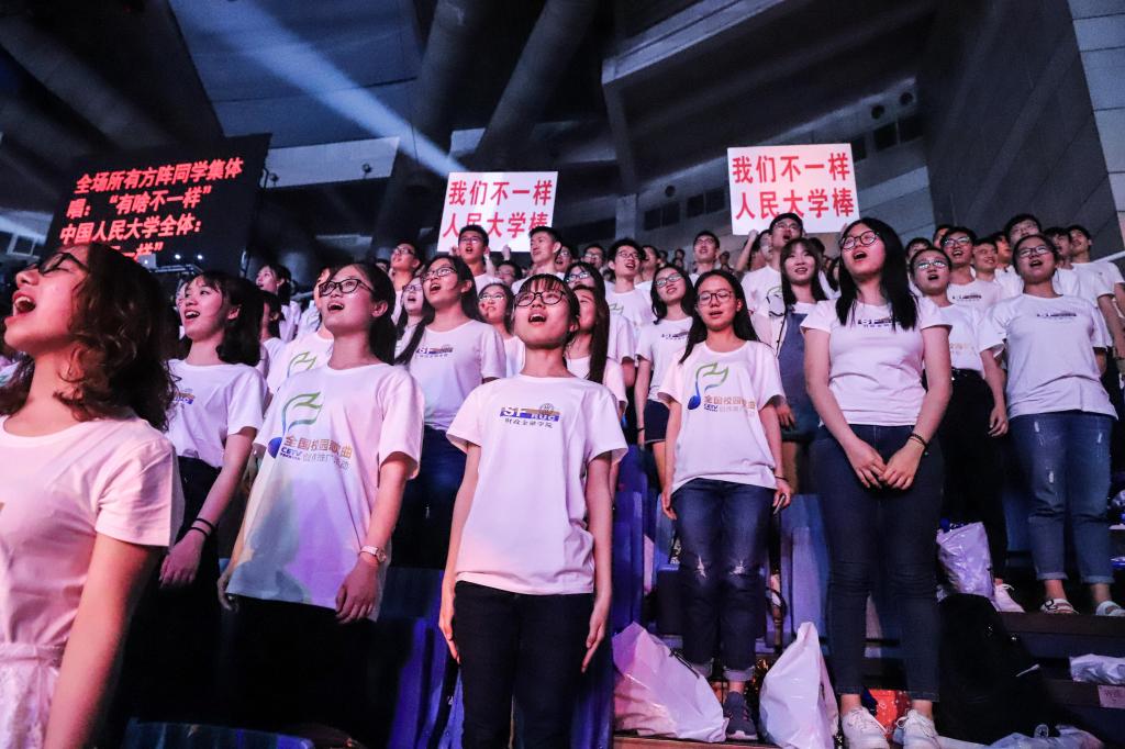 参与活动的还有来自各大高校的学生代表们,我校部分同学到场观看。虽然坐在观众席上,但演出过程中的拉歌,使同学们成为了主角。我校方阵对阵东道主清华大学,承担第一次拉歌第二首曲目的表演,地位十分重要。我校领队任翔宇同学高声道,“人民大学不一样!”。我校方阵全体起立,自信地唱道:“就是不一样!”,随后唱响《我们不一样》,震撼全场。当舞台上表演歌曲时,以色情动漫 学生为主的我校方阵负责与曲目的配合——时而点亮拇指灯,时而挥动红旗,时而举起红心……导演组的精心编排与同学们的多次排练成就了美妙绝伦的演出效果。最后环节,各校派出代表进行宣誓,我校王庆硕同学上台。“我们是实现中华民族伟大复兴的生力军,我们是中国梦的追梦人,我们更是中国梦的圆梦人”。铿锵誓言,是新时代新青年的承诺。