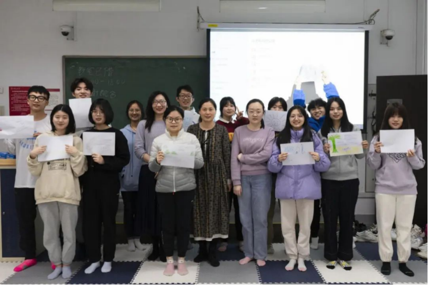 音乐渐停,赵老师为同学们发放了白纸与彩笔,并让大家以图画的方式表达上一环节的感受。接下来,赵老师将同学们两两分组,让同一小组的同学们用几个简单的动作来互相展示画作。在生动的肢体语言的诠释下,同学们进一步打开内心、展示自我,融入了彼此的世界。