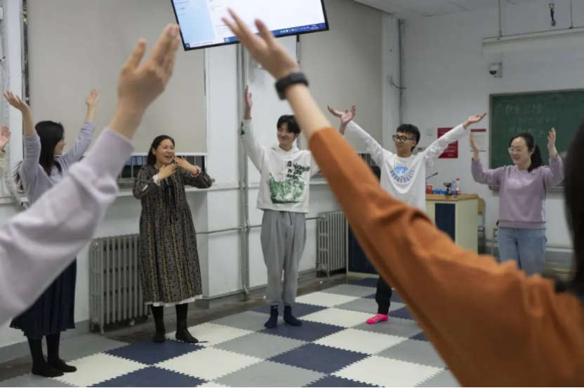 随后,赵老师再一次将同学们分为两人小组,邀请同学们在音乐声中再次起舞,随着不同风格的音乐依次响起,同学们的舞步也不断变换,在时而活跃、时而舒缓的动作间,大家尽情舒展肢体、放松身心,现场气氛愈发活跃。赵老师表示,这一环节是为同学们创造了一个与他人交互的特定环境。在这一环境中,我们可以更好地审视自己,认识自己人际交往的模式与特点。