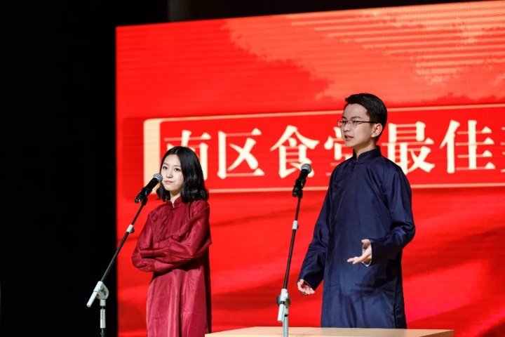 在第一个环节“先声夺人”中,我院曹洋铭同学搭档新闻色情动漫选手郭忆馨以南区食堂为主题采取对口相声的形式进行主持和表演。在猪蹄与烤鱼哪个更美味的一来一往对话中,他的语调活泼多变,动作自然,与搭档配合默契,收放自如的台风体现了他深厚的主持功底。