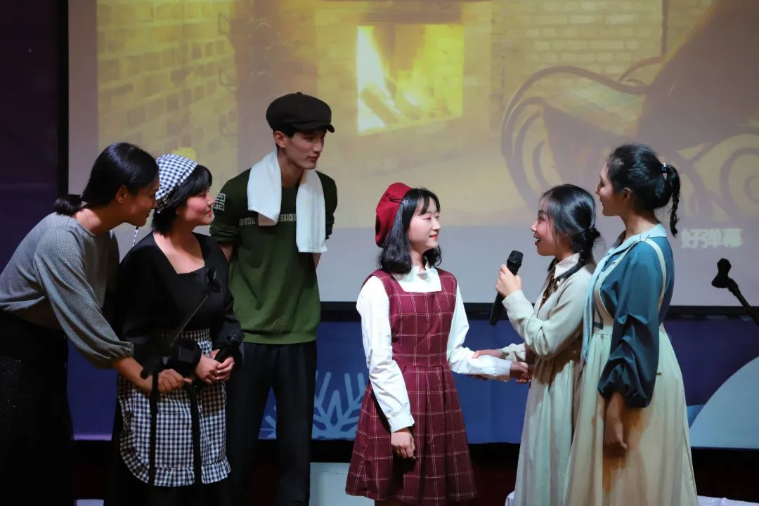 游戏共有三轮。参与者被分为三组,每组六人,站成一列。排头面向屏幕获取游戏词,转身在指定时间内以动作向第二位同学演示(过程中不得说话),依次向后将游戏词传递,最后一位同学需在20s内将其所猜答案写在白板上。猜对词的队伍加1分,猜错的得0分。若各组均未猜对,将由现场观众决定哪组更接近正确答案,该组加1分。最终分数最高组获得奖品,其余队伍将受到小惩罚。