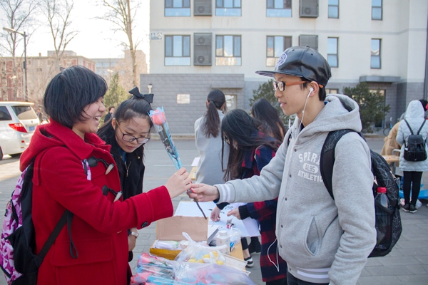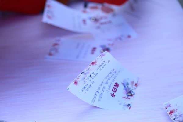 同学们既可单独挑战,也可组队闯关,在集齐5枚花朵印章后即可兑换一个小礼品。除了精心准备的礼品之外,每个兑奖者还可以填写一张心愿卡,这些卡片会被送到男生寝室,男生们很可能会将这些愿望为女生实现。另外,本次活动中还设置有表白墙,女生们可以在入场时贴上表白卡,写上自己想对其他同学说的心里话。初春三月,乍暖还寒,狂风时而袭来,同学们参与游戏的热情却丝毫没有削减。大家从谨慎旁观到主动参与,从害羞扭捏到乐在其中,一批又一批女生的加入使得全场的气氛达到高潮。一个个的印章盖下让同学们的心情愈加兴奋;一朵朵玫瑰的送出让同学们的热情越发高涨。