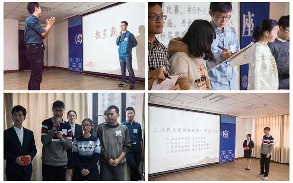 本次活动分为三个环节,分别为知识竞赛、优秀作品展示及颁奖仪式。比赛环节中,第一模块“志在必得”考验了选手们对人大的了解。选手们反应迅速,对答如流。连续三组答题全部正确,将难题一一拿下。在第二模块“你比我猜”中,选手们奇计百出,猜出了“飞夺泸定桥”、“叶剑英”、“鹰击长空、鱼翔浅底”等高难度词汇。形象的描述和夸张的动作使现场气氛更加活跃。随后进行的“逆流而上”模块,选手们从“长征路线”、“重要节点”、“感动人物”三个部分中选题作答,表现精彩。最后的“汉字之家”模块,选手们书写了“醍醐灌顶”,“踵事增华”等笔画复杂,生僻晦涩的成语。选手们书写正确率之高赢得阵阵掌声。最终,16级金融四班夺得知识竞赛冠军。