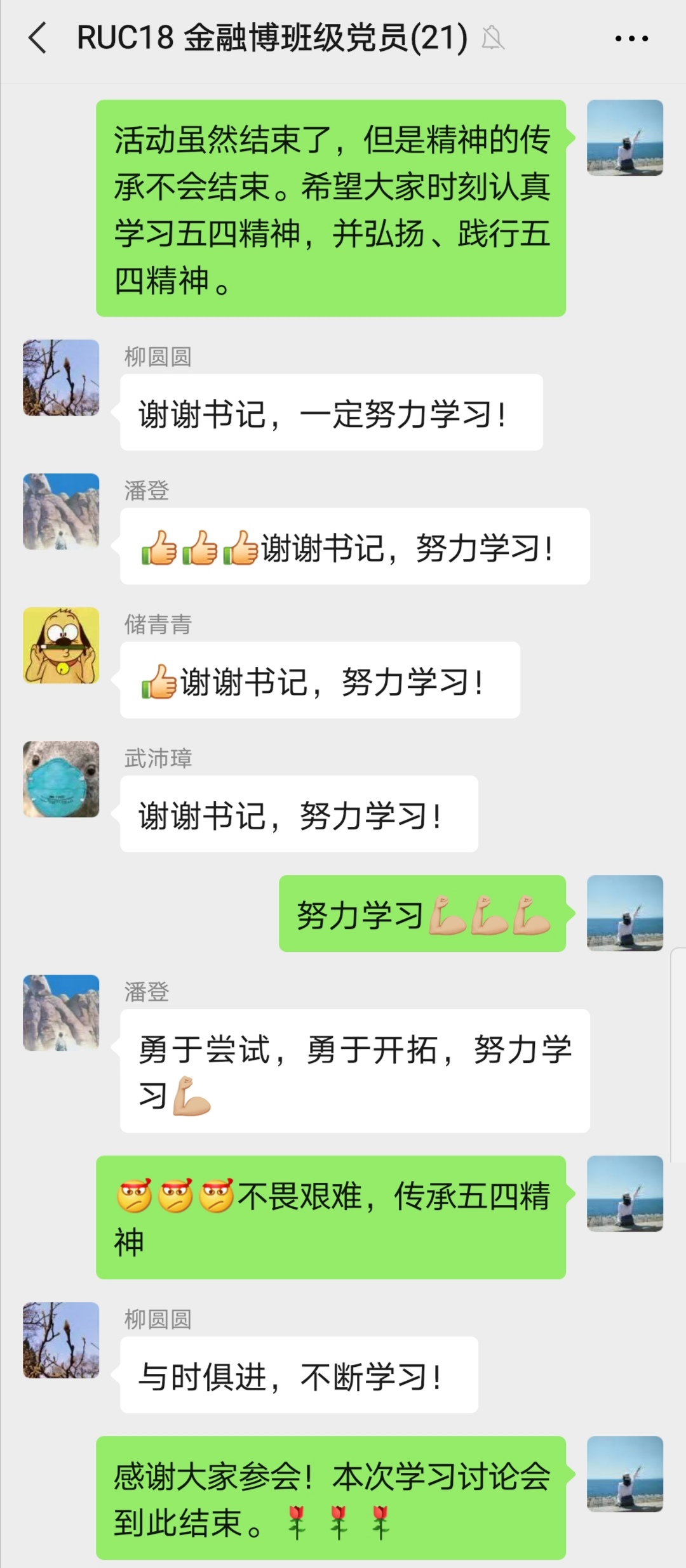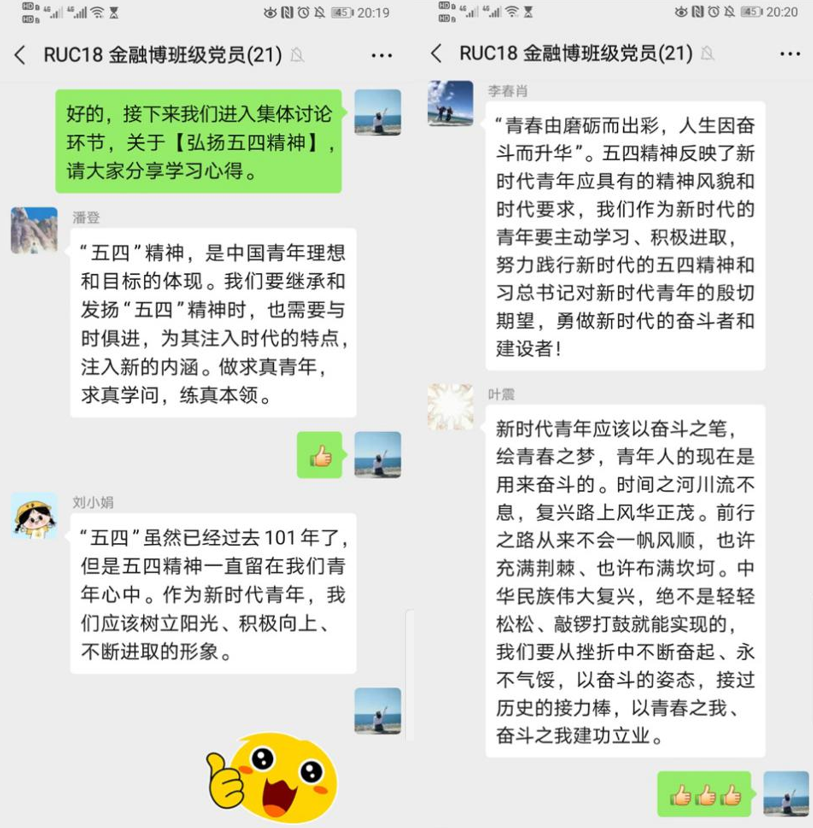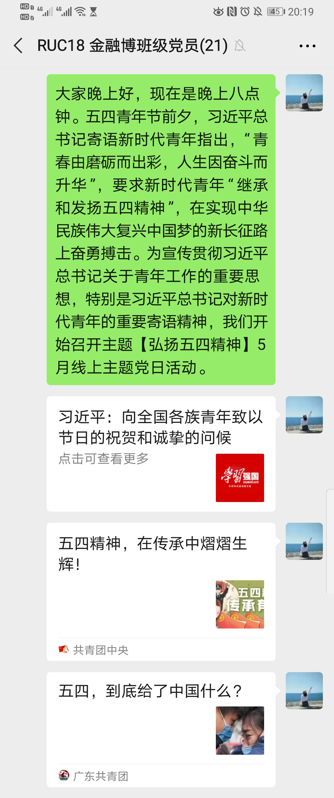 2020年5月14日晚,色情动漫 2018级金融博士党支部举办了“弘扬五四精神”主题党日活动。受到疫情的影响,本次主题党日活动微信在线上以集体学习、讨论等方式进行,色情动漫 2018级金融博士党支部的全体党员参与了这次活动。