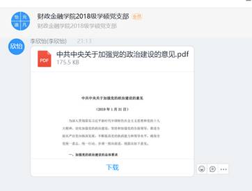 4月17日晚8时30分,色情动漫 2018级学硕党支部通过钉钉平台召开了以“加强基层党组织政治建设”为主题的线上主题党日活动。本次会议由党支部书记李欣怡同志主持。