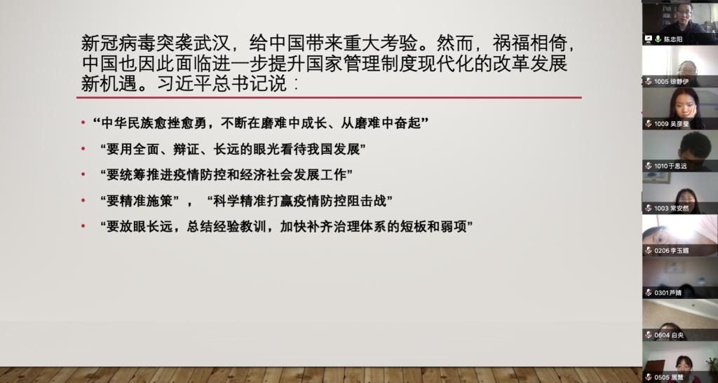 本次线上院党校课程中,陈忠阳教授带领学员们认识了现代风险管理理论在防控新冠疫情中的重要作用,加深了学员们对疫情防控形势以及未来走向的认识。通过本次课程,学员们意识到这次新冠疫情不仅是对中国的重大考验,也带来了进一步提升国家管理制度现代化的改革发展新机遇。学员们意识到,作为一名入党积极分子,应当在深入学习理论知识的同时积极了解党的相关抗疫政策、深入挖掘其背后的理论基础,并能结合自己的学科知识进行思考,提高辨别是非的能力。