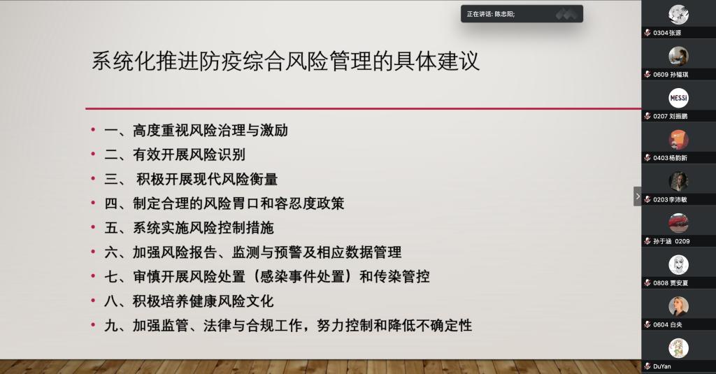 陈忠阳教授与学员们分享了可适用于下半场抗疫的现代风险管理理念。他指出,风险管理的本质内涵是事前管理,是承担风险的管理而不是拒绝风险的管理。陈教授也分享了系统化推进防疫综合风险管理的具体建议,包括高度重视风险管理治理与激励、有效开展风险识别、积极开展现代风险衡量等。