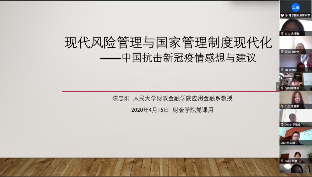 本次党课的主题为“现代风险管理与国家管理制度现代化——中国抗击新冠疫情感想与建议”,陈忠阳教授结合当前中国抗击新冠疫情的形势,从风险管理与管理制度现代化的角度分享了自己的观点与建议。