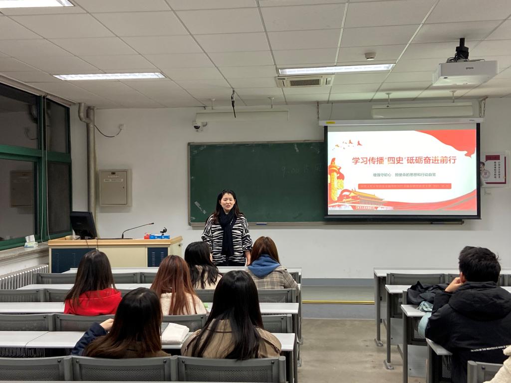 2021年10月20日晚,2021级金融专硕四班党支部于公共教学三楼3507教室开展“学‘四史’守初心”主题党日活动。支部成员共19人参与此次活动,活动由党支部书记王璐主持。
