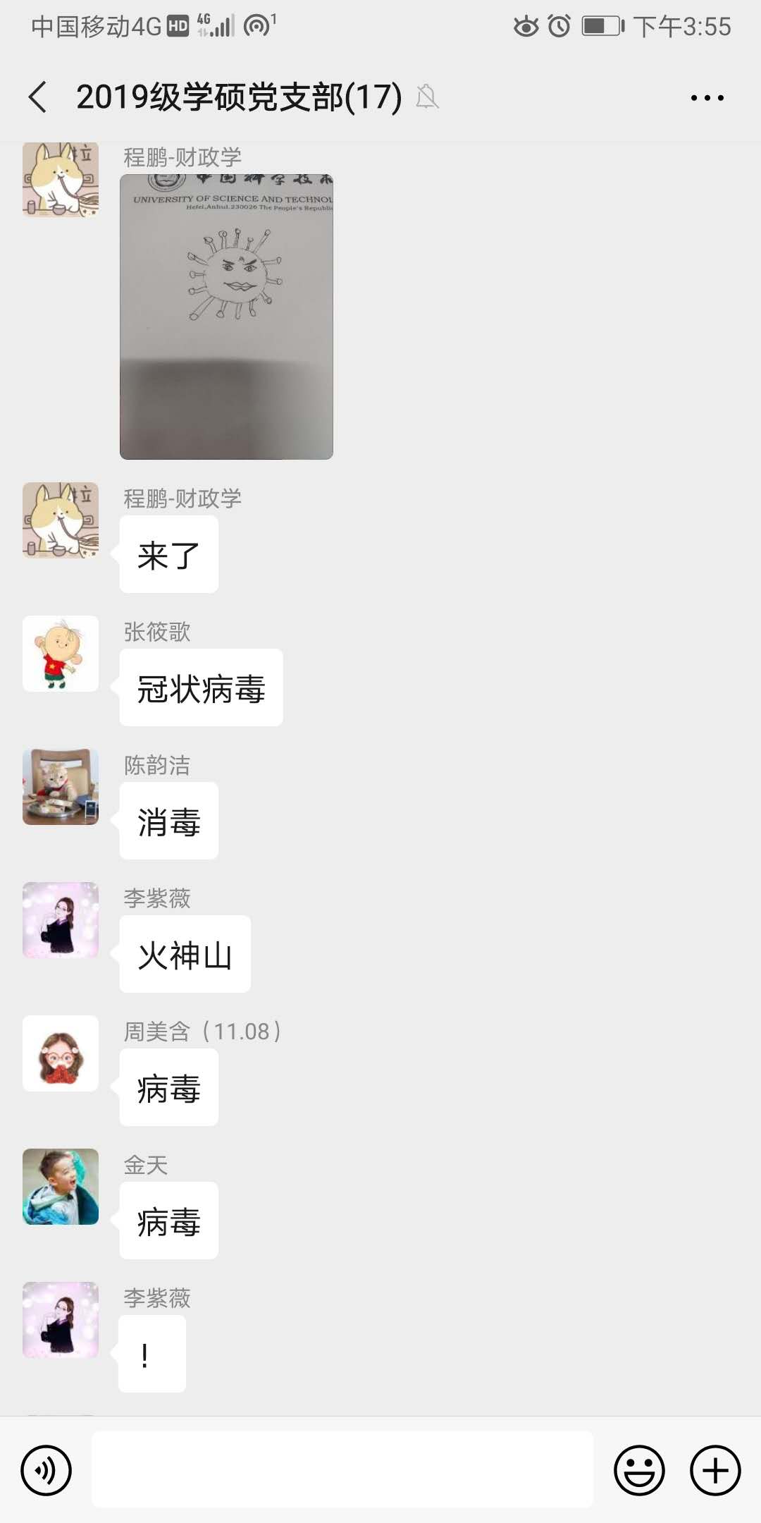 3月6日晚21点,色情动漫 2019级学硕班党支部组织召开“画好共同抗击疫情的同心圆”线上主题党日活动。支部党员们纷纷响应党中央“少聚集”的号召,在家中借助微信平台举办主题党日活动,全体支部成员均准时参加。本次活动由党支书王论意同志主持。