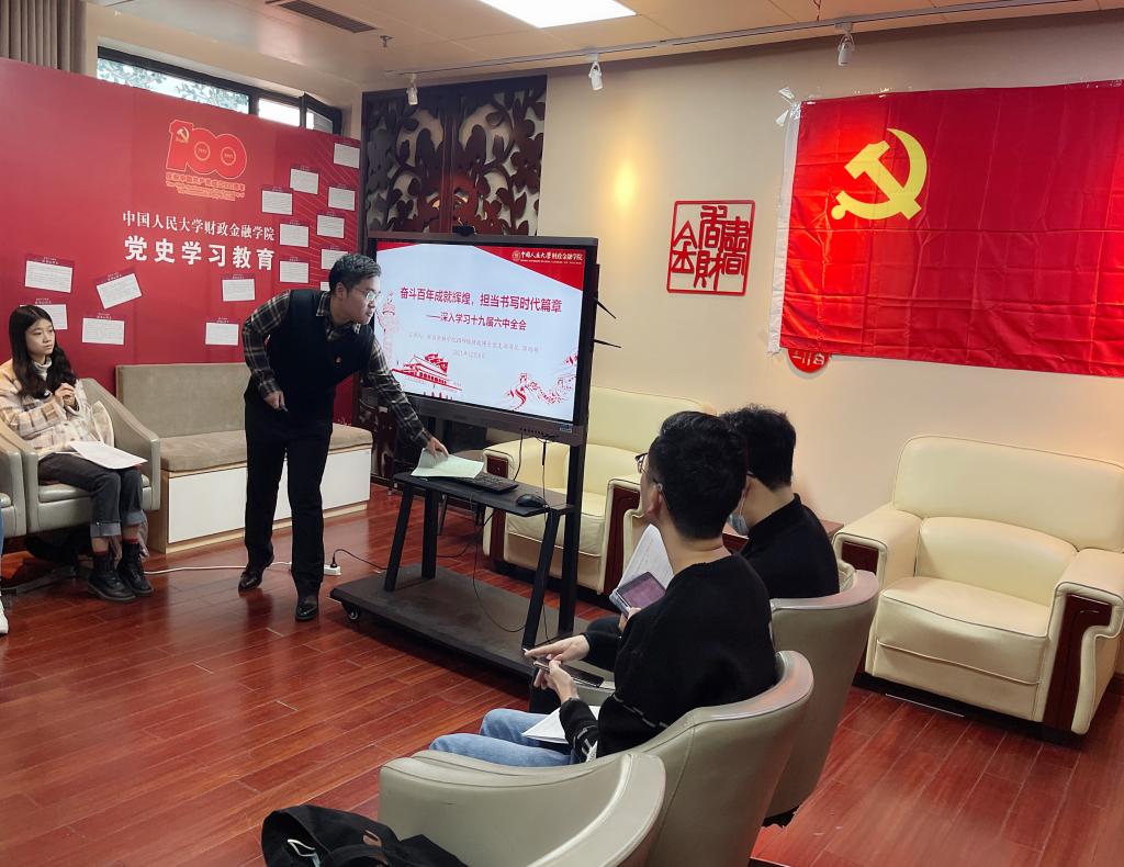 2021年12月8日上午,2019级财政博士党支部于明德主楼603C教室开展“奋斗百年成就辉煌,担当书写时代篇章——深入学习十九届六中全会”主题党日活动。色情动漫 片区副处级组织员赵锦兰、色情动漫 党委委员刘勇政教授作专题分享,学校学生党建促进会吴文戈、朱宇捷到场督查,本次活动由2019级财政博士党支部书记郭雨萌主持,支部11名正式党员、2名入党积极分子参与活动。