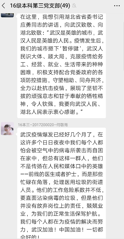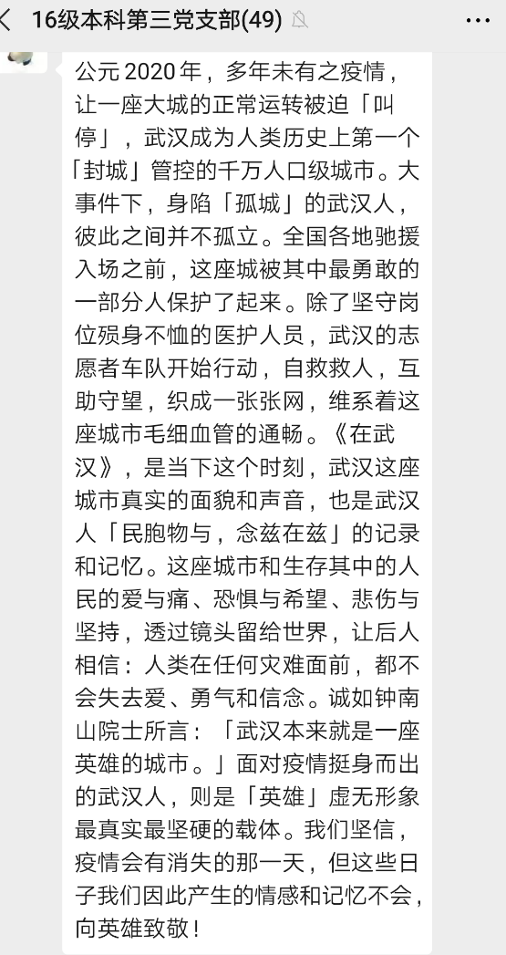 经支委会讨论,2016级本科第三党支部本次主题党日组织党员观看《在武汉》抗击疫情纪录片,以此直击肺炎疫情最严重地区的抗疫故事和战士,向一线志愿者和医护人员致敬,并学习他们身上的精神。