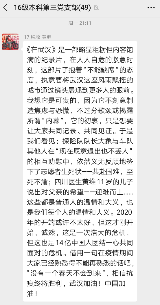 线上主题党日|2016级本科第三党支部观看抗疫纪录片,致敬抗疫工作者