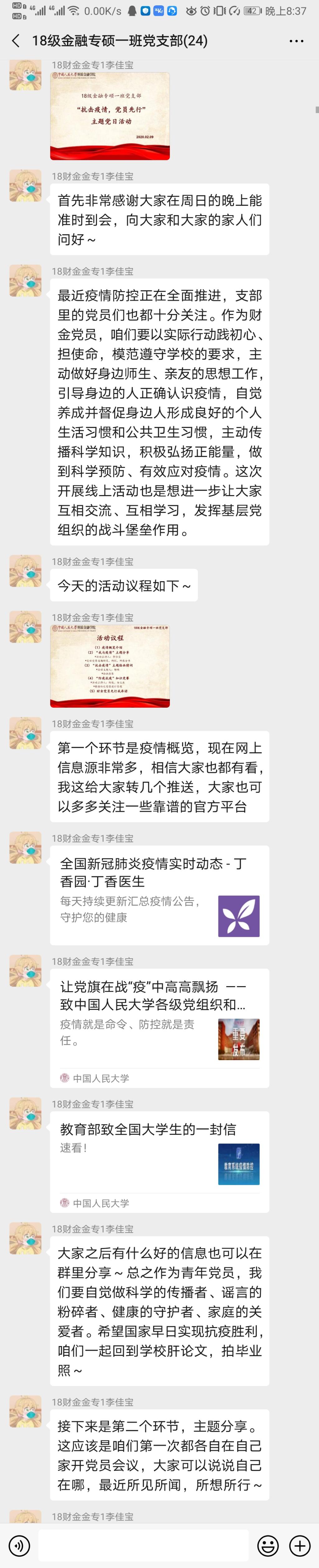 2月9日晚19时,2018级金融专硕一班党支部组织召开“抗击疫情,党员先行”线上主题党日活动。在疫情面前,支部党员们纷纷响应党中央“少聚集”的号召,在家中借助微信平台举办主题党日活动,全体支部成员均准时参加。