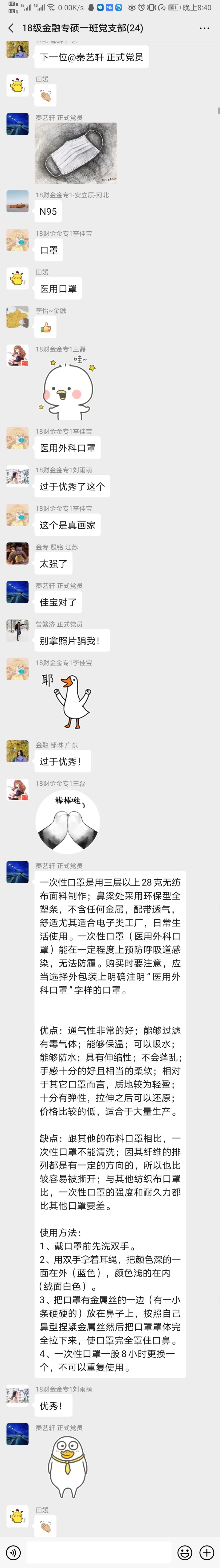 活动伊始,党支部书记李佳宝介绍了本次活动主题和会议议程,并对当前疫情局势进行了简单介绍,同时督促同志们注意个人卫生和健康防护,助力抗疫要从保护好自己开始。“不忘初心、牢记使命”主题教育刚刚结束,作为财金党员,要将主题教育所学用于实际,以实际行动践初心、担使命,主动做好身边师生、亲友的思想工作,引导身边的人正确认识疫情。支部成员们也主动分享了不少关于疫情防护的公众号文章,互相督促、互相鼓励