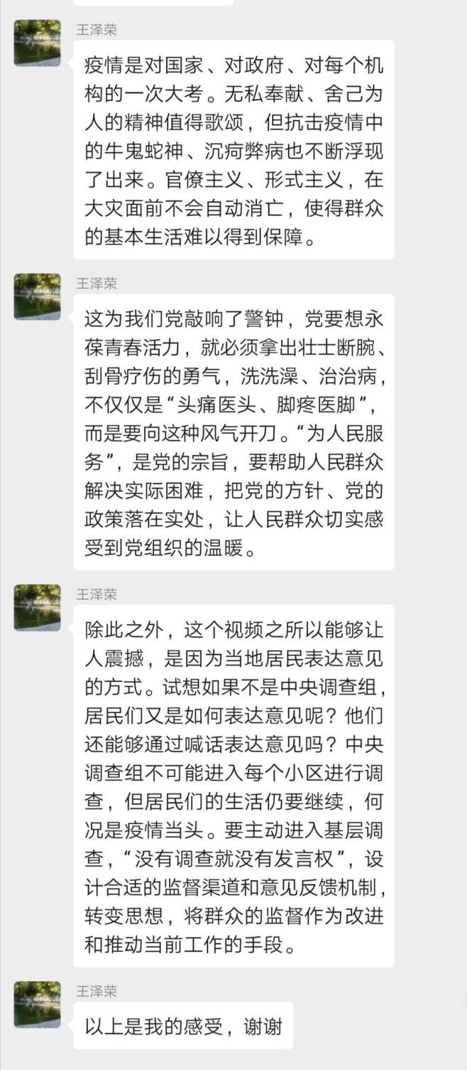 由岳子航同学介绍的第四段视频,主要内容为35日,中央指导组在武汉市青山区翠园社区开元公馆小区考察时,有居民隔窗高呼"假的",反映社区物业假装让志愿者送菜送肉给业主,实际工作不到位的情况。王泽荣同志点评到,群众的眼睛是雪亮的,形式主义、官僚主义不能解决社区群众基本生活保障的短板;疫情当头,党员应主动进入基层调查,“没有调查就没有发言权”,设计合适的监督渠道和意见反馈机制,转变思想,将群众的监督作为改进和推动当前工作的手段。