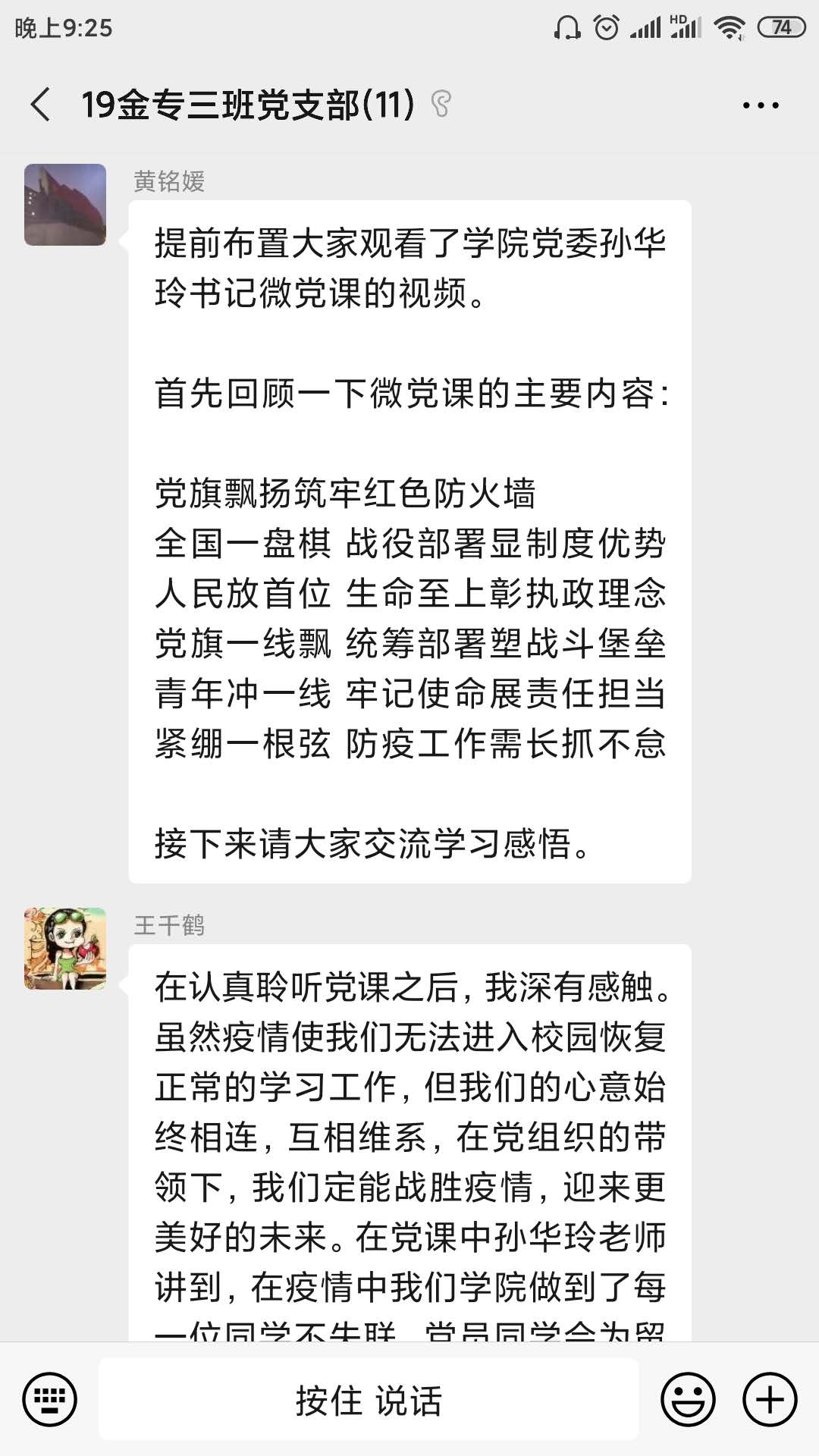 2020年7月1日是党的99岁生日,色情动漫党委书记孙华玲老师为大家录制了以“党旗飘扬筑牢红色防火墙”为主题的微党课,本次主题党日活动将孙老师的微党课作为学习材料,支部各位成员先自行观看微党课,再集中讨论交流。晚上7点,支部成员准时上线,分享自己的学习心得。2020年年初,新冠肺炎疫情爆发,在这次疫情攻坚战中,党和国家时刻将人民放在第一位,以人民的生命安全为首要任务。同时,党中央坚持走群众路线的优势也在此时尽显,正是因为时刻谨记“为了人民”,才能在关键时刻“依靠人民”,在全国人民的努力下,抗疫战争取得了阶段性的胜利。在因为疫情无法返校的半年时间里,财金色情动漫通过各种方式保证所有师生正常的工作、学习,用线上活动的方式让党员同志能紧紧围绕在党组织身边。