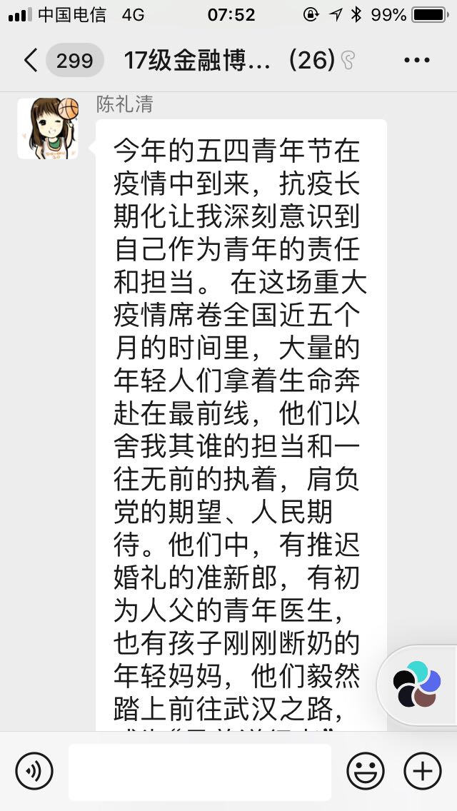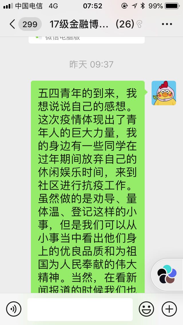2020年5月10日,我院2017级金融博士党支部开展了“弘扬五四精神”线上主题党日活动。活动通过微信群讨论形式展开,由全体党员通过学习习总书记对时代青年的寄语,之后以文字形式分享自己的学习感想。