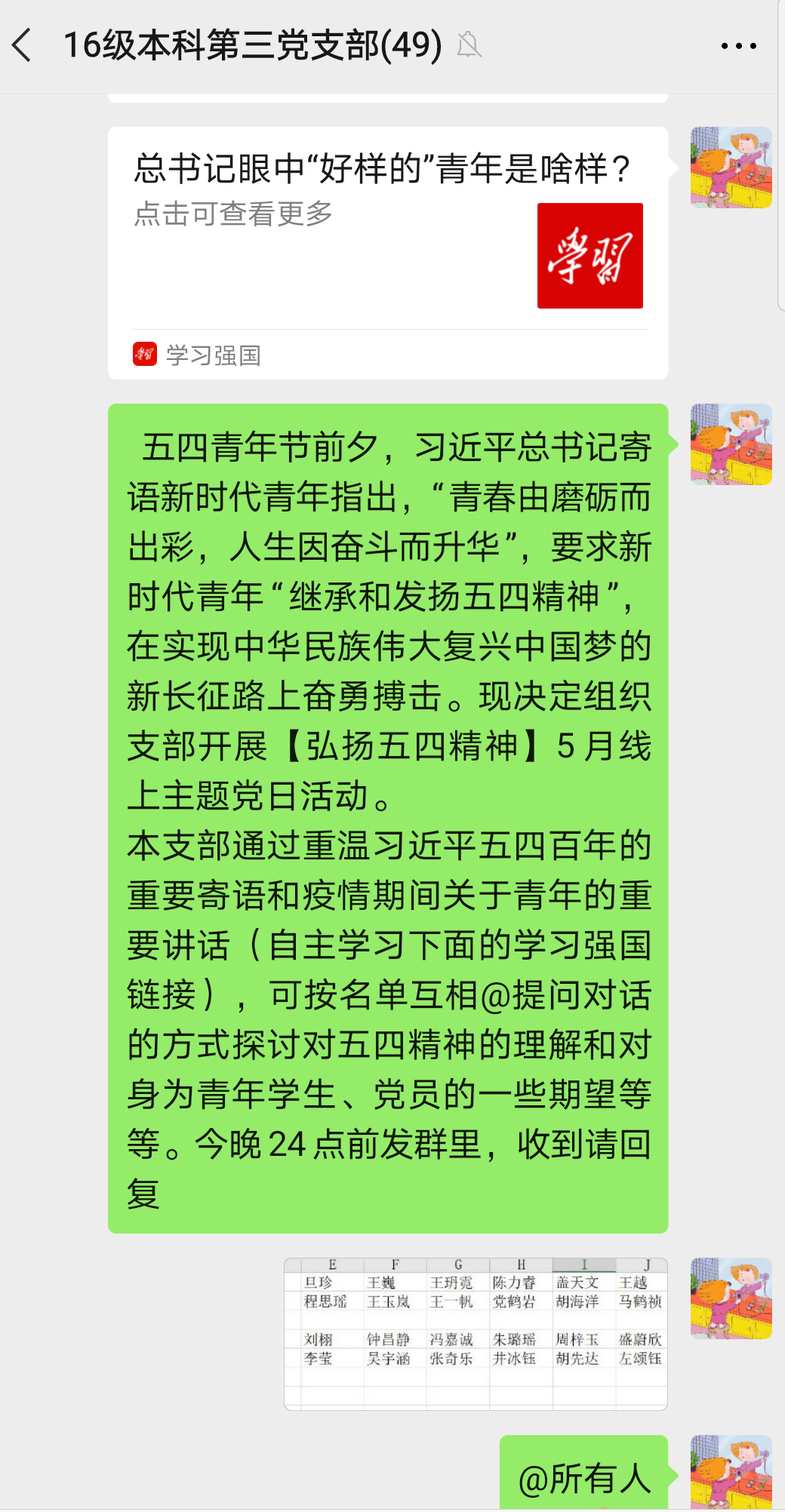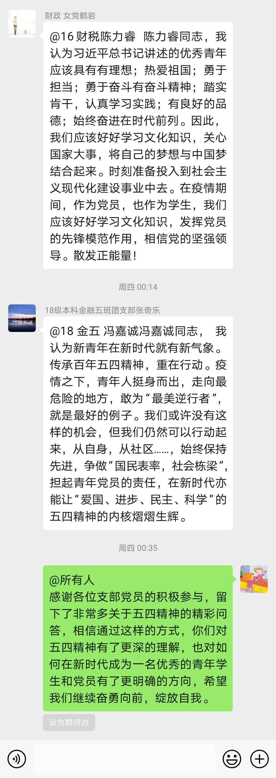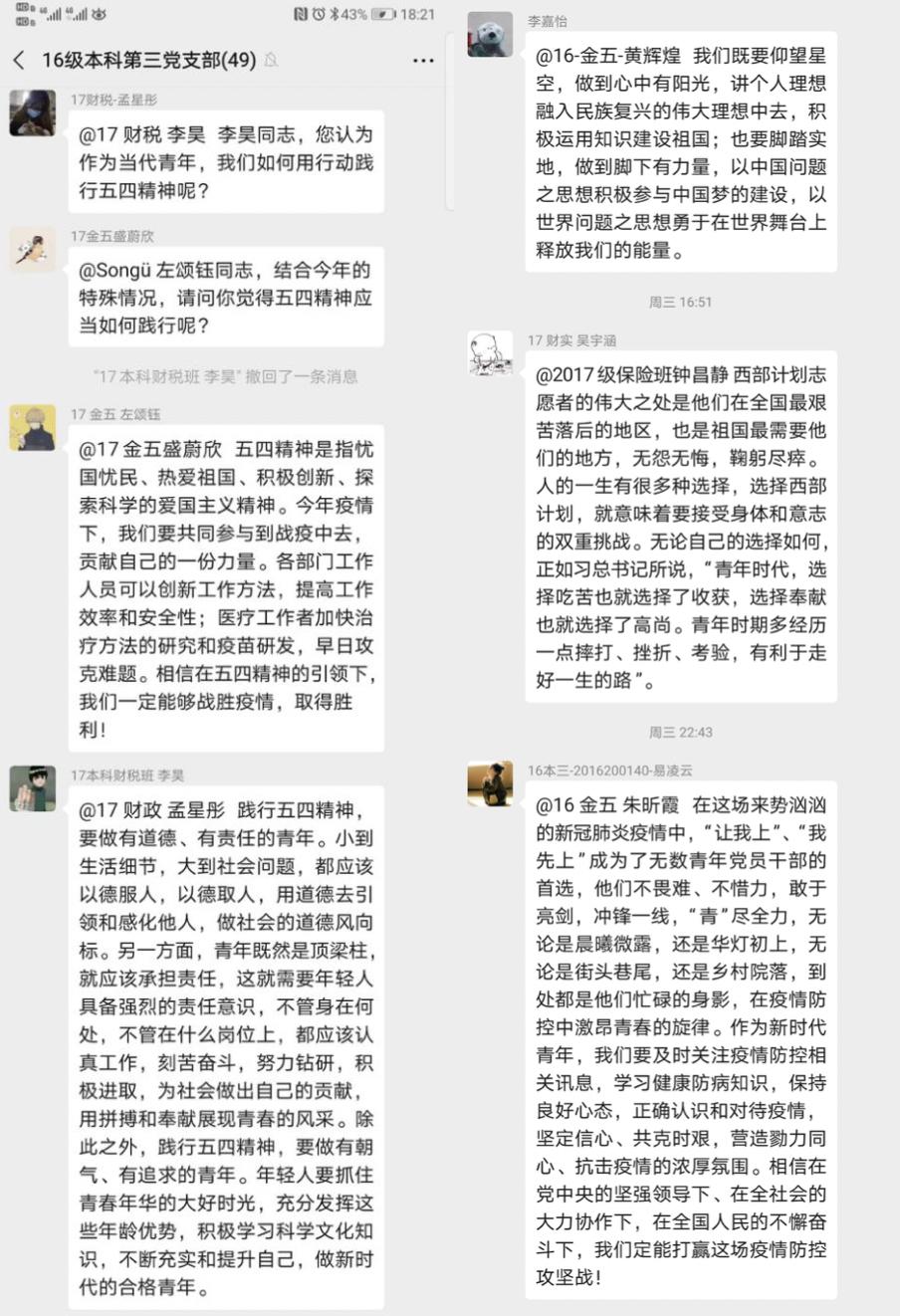 支部通过重温习近平总书记在纪念五四运动一百周年大会上的重要讲话和疫情期间关于青年的重要讲话,并在微信群内互相提问、对话的方式探讨各自对五四精神的理解和对身为青年学生、党员的自己的一些期望等等。