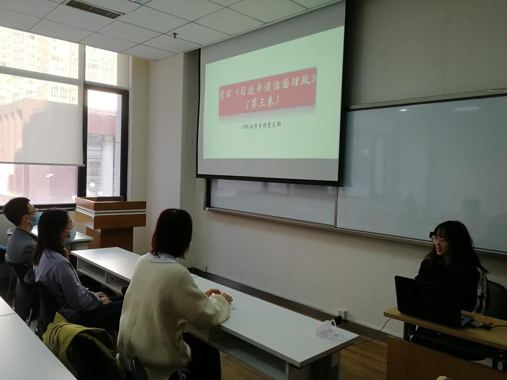 2020年10月19日,2018级汉青学硕党支部在明德主楼307教室举办了主题党日活动,主题为学习《习近平谈治国理政》(第三卷)。支部决定以共同学习并讨论感想的方式开展这一次主题党日活动,以增加主题党日的互动性与趣味性。党支部全体成员参会,其中4名党员线下参会,2名党员线上参会。会议由支部书记李梦祎主持。