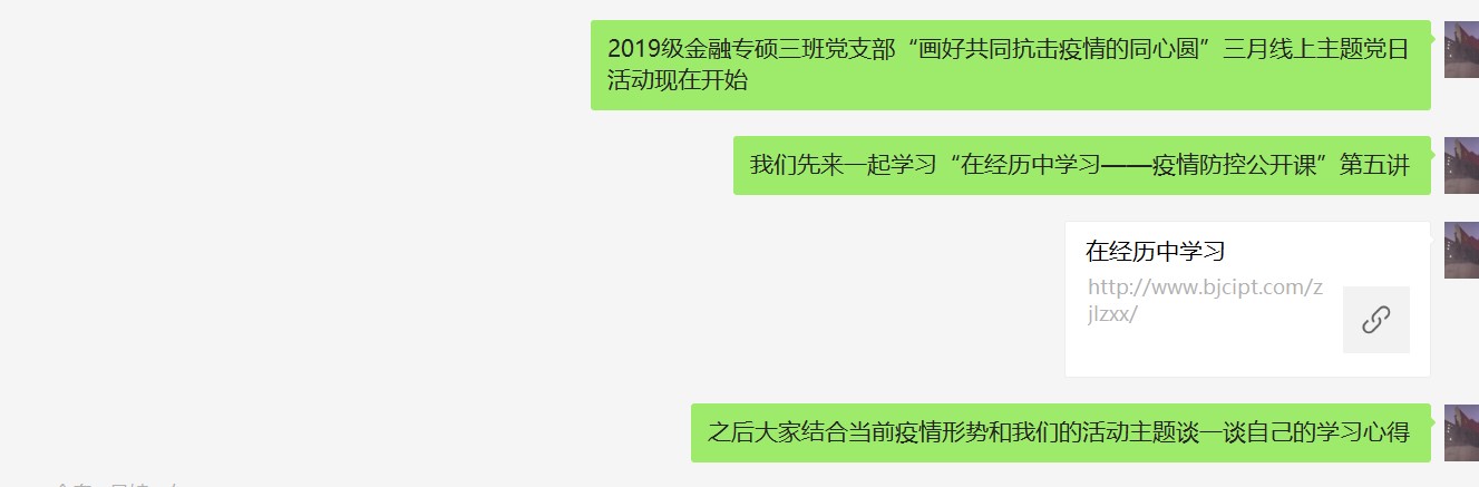 2020年3月14日下午3时,2019级金融专硕三班党支部在微信群中以线上学习和讨论的形式举办了“画好共同抗击疫情的同心圆”三月线上主题党日活动,本次活动共11名正式党员参与。