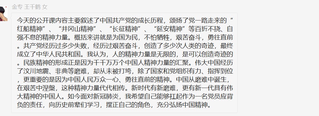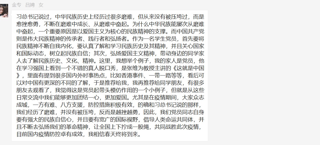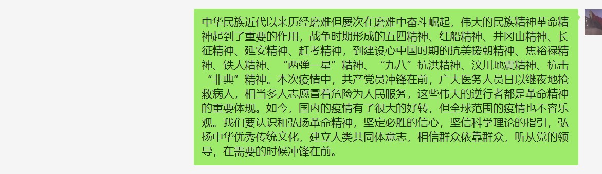 支部全体同志都对这一主题发表了自己的看法,中华民族自古以来就经历过很多磨难,所谓“多难兴邦”,正是指中华民族在磨难中形成了一系列的革命精神:艰苦创业、不畏艰难的奋斗精神,“天下兴亡,匹夫有责”的爱国精神,万众一心,众志成城的团结互助精神……马克思主义传入中国以来,中国共产党将马克思主义中国化,带领中国人民革命、改革、奋斗,在继承了中华民族传统的革命精神以外,还发展出了以人民为中心,相信群众,依靠群众的“鱼水情深”精神。正是由于党始终全心全意为人民服务,疫情当头,才能在关键时刻动员人民、依靠人民一起共抗疫情,取得胜利。
